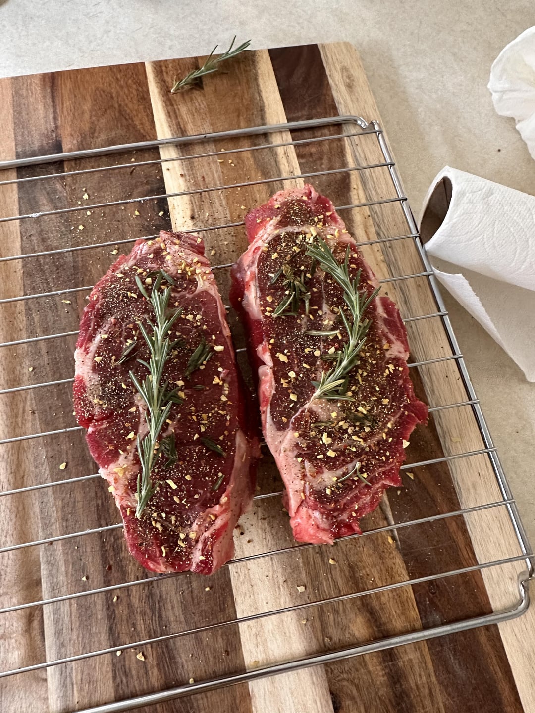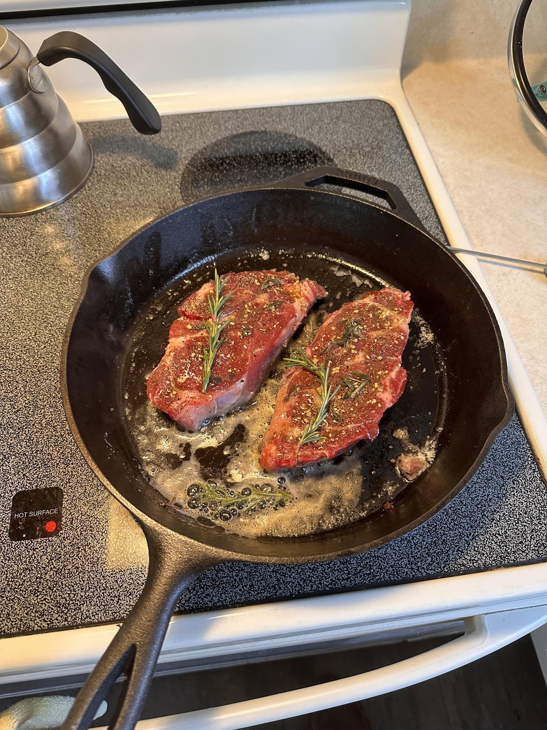Salted and rested in the fridge for 8 hours, brought up to temp for an hour, and rested after the pan.