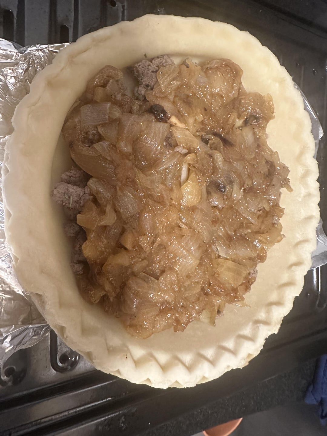 Made this pie on Saturday using ground beef, caramelized onions, and gruyere cheese, and thought I’d share the results with my new favorite community.