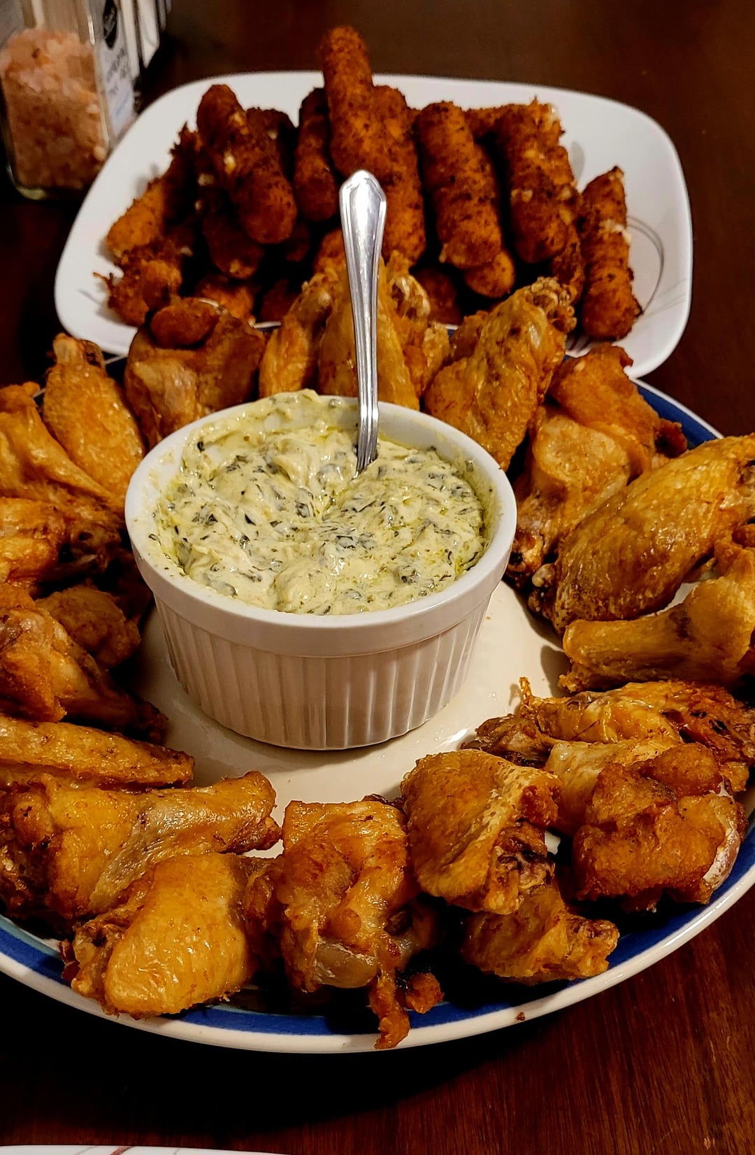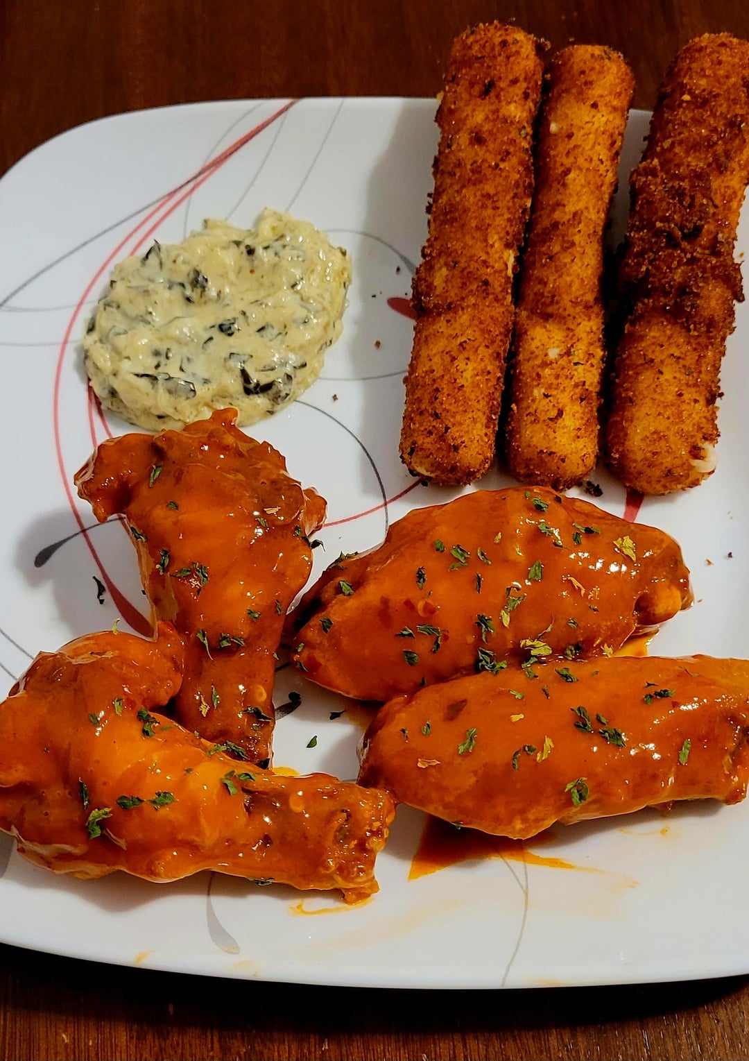 Made some Homemade Buffalo Sauce(with Arbol Peppers, Franks and KerryGold Butter). Asian Zing Sauce for the wife. Some homemade cheese sticks with Chips and Artichoke dip. Also homemade ranch. Fried the wings in canola oil. Heck of a good night XD