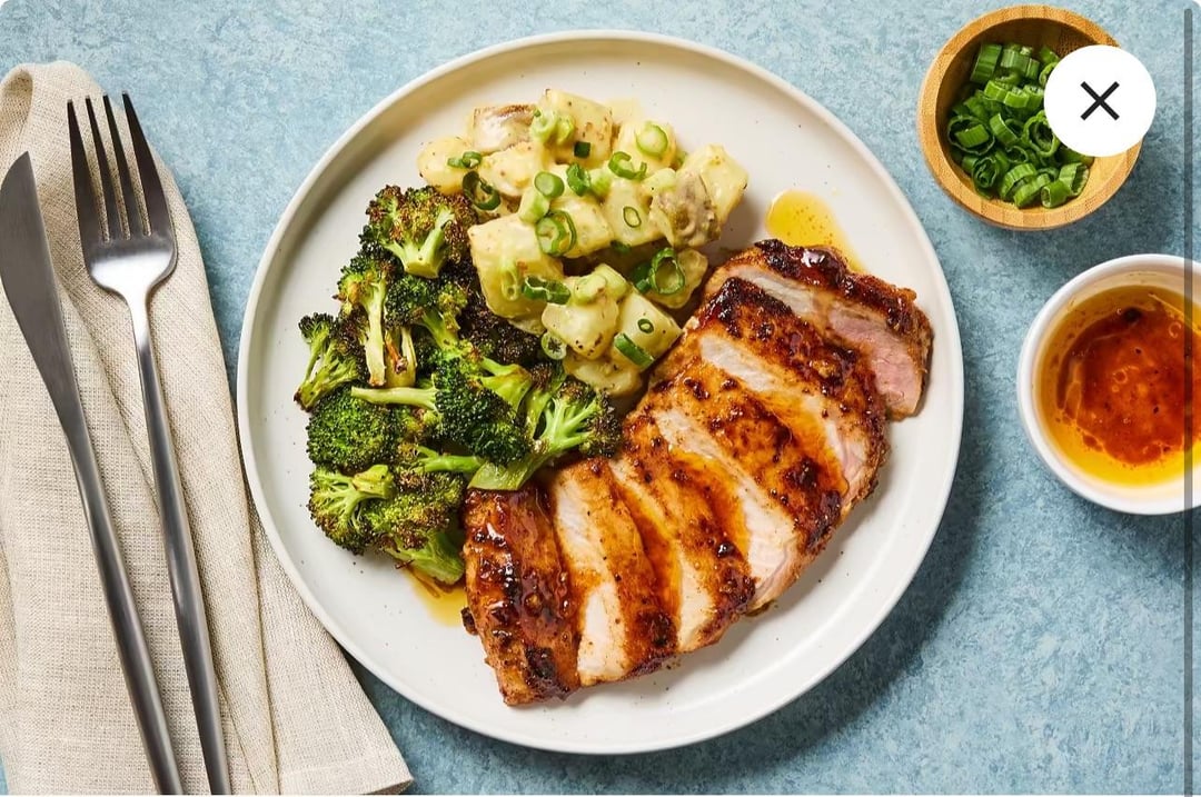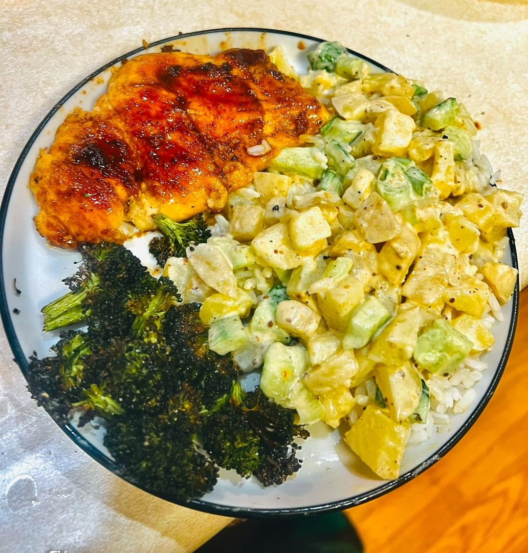 My first HelloFresh meal. It was actually pretty easy and quick to make! The chicken was super moist. I prefer boiled broccoli over baked so that's something I might do differently next time. The potatoes were also good, I added some cucumbers as well.