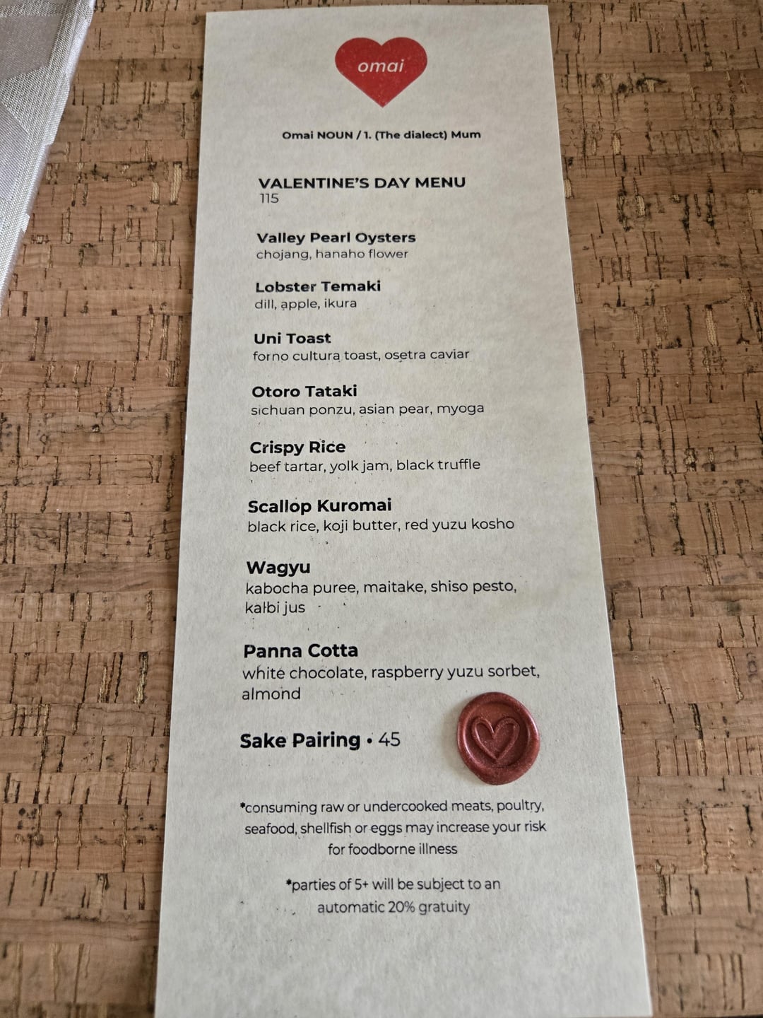 The Valentines menu is $115 vs the standard $95, with a few small changes (Lobster Temaki instead of Tuna Truffle Temaki; Caviar instead of Salmon roe on the uni toast; Panna Cotta instead of Monaka).