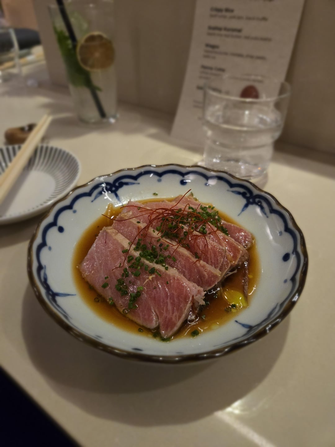 Otoro Tataki: tuna belly, nicely balanced with the ponzu and complemented with the strands of myoga and pear underneath it all.