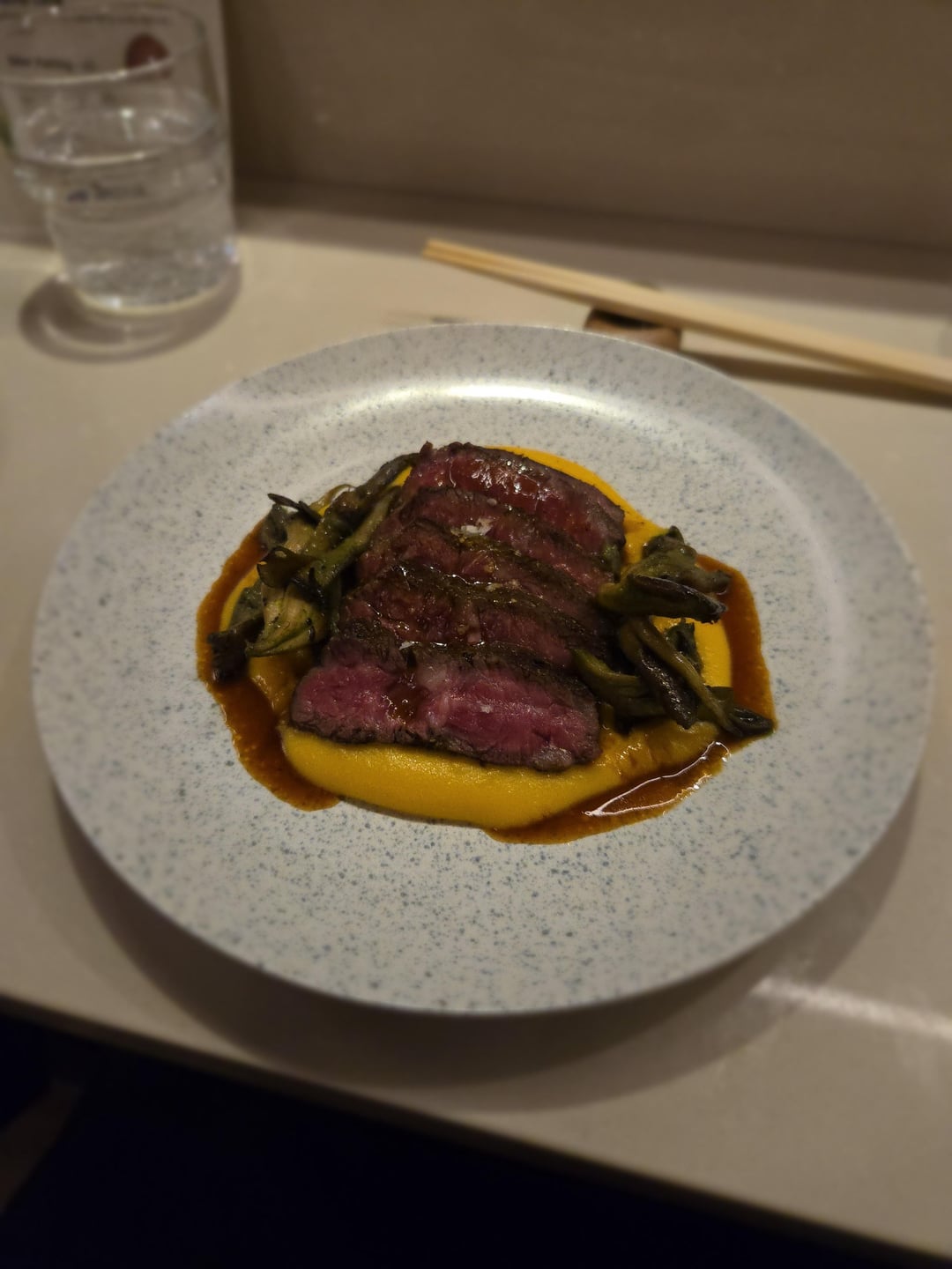 Wagyu: an excellent cook, the sweet kabocha puree was a nice contrast to the earthy maitake in the pesto. I will mention, my sister’s wagyu was plated standing up vs. mine that was cascaded, which seemed like an amateur move. I was surprised to not get a spoon with this dish despite how much puree and liquid is in it.