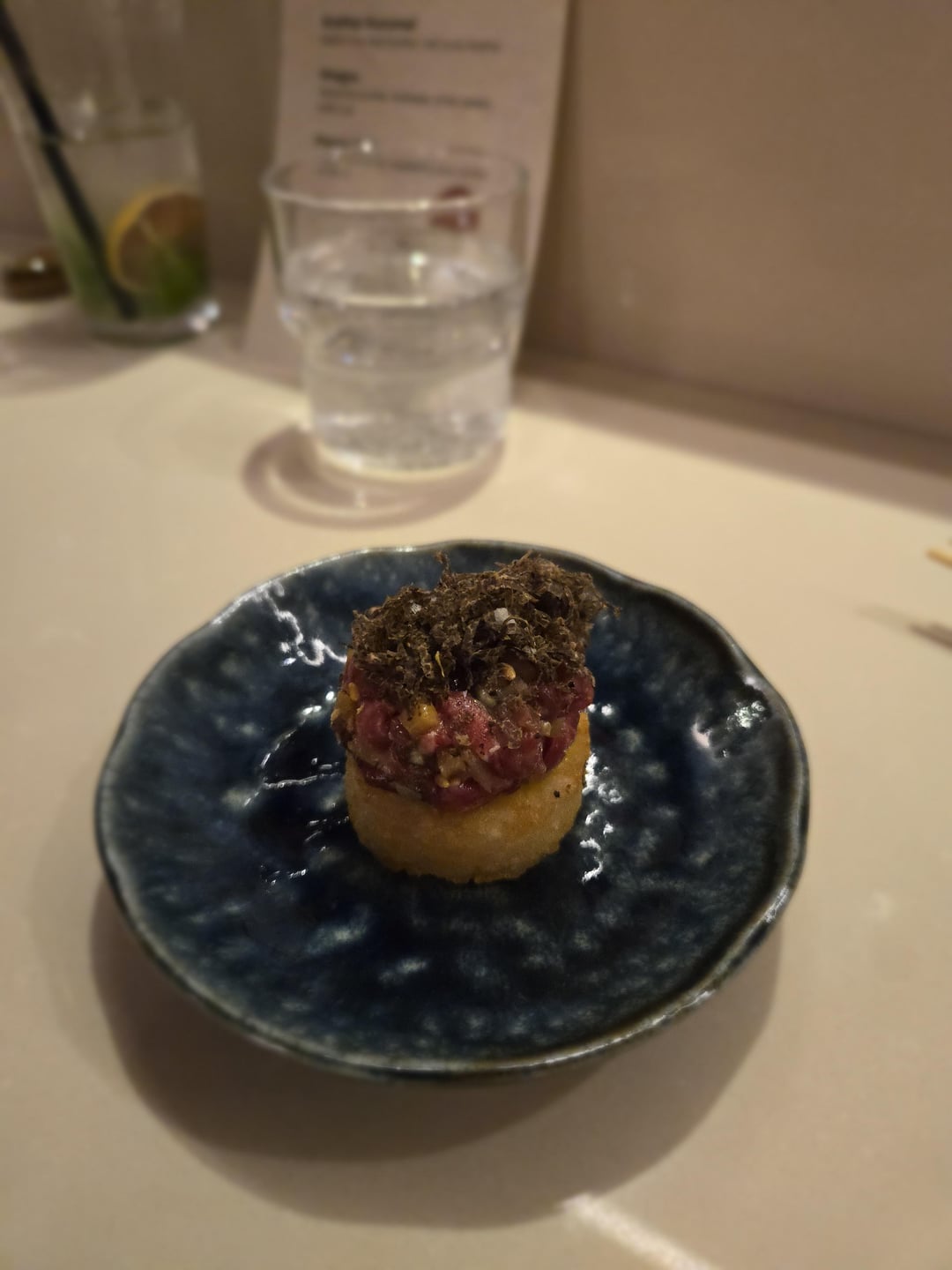 Crispy Rice: beef tartar (made from what felt like a fairly large mince) on a crispy rice cushion and topped with shaved truffle; I felt that the yolk jam was completely lost. Good, but uninspired.