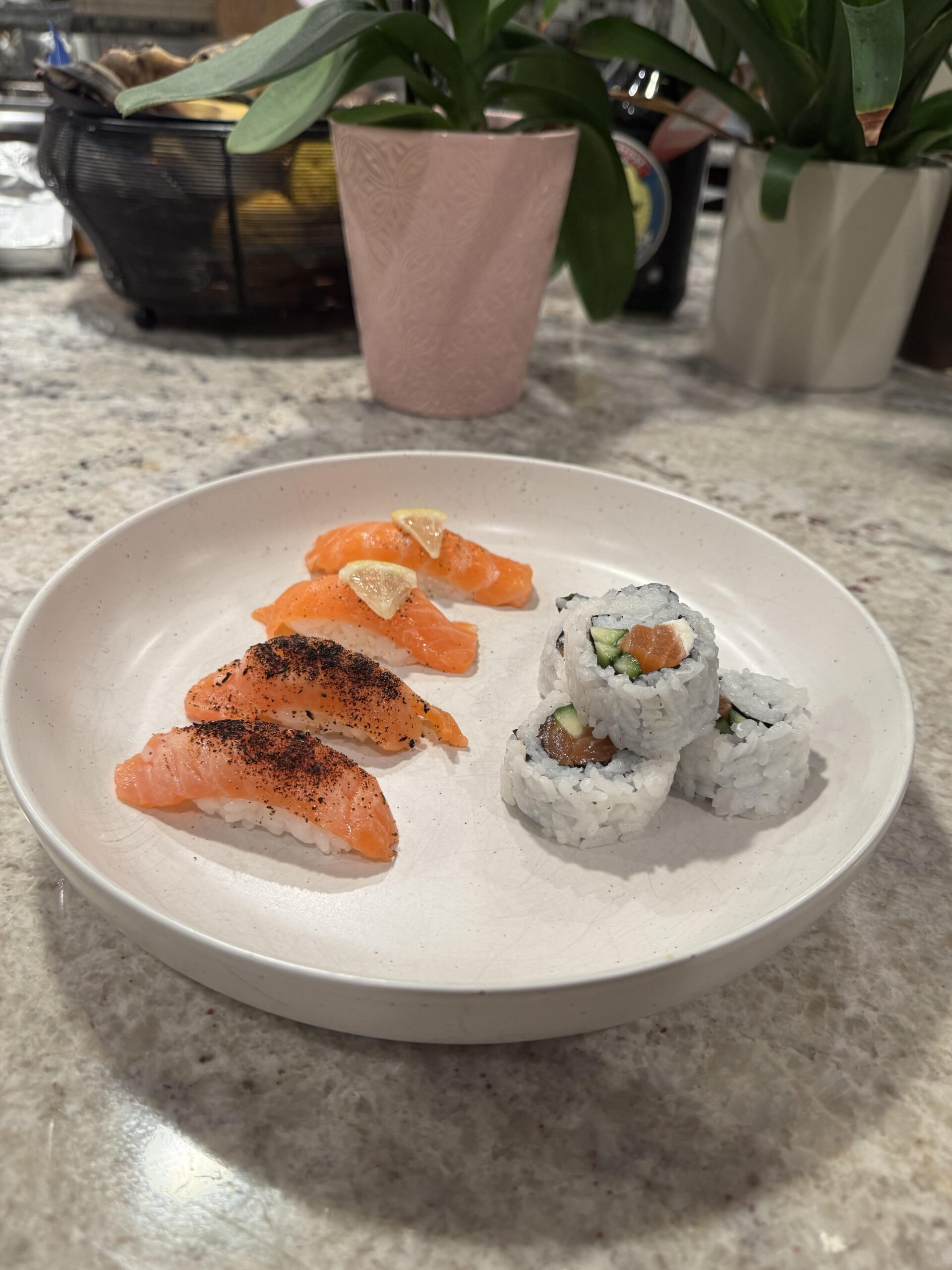 Particular_Ticket964 9 months ago Looks nice! what’s the black crumbles on the salmon nigiri?If you toched it, then that’s a clear signal you used direct flame for it. Just give it a long enough distance like toasting cigars.Using direct flame sometime infuse an unpleasant smell into the neta as well.