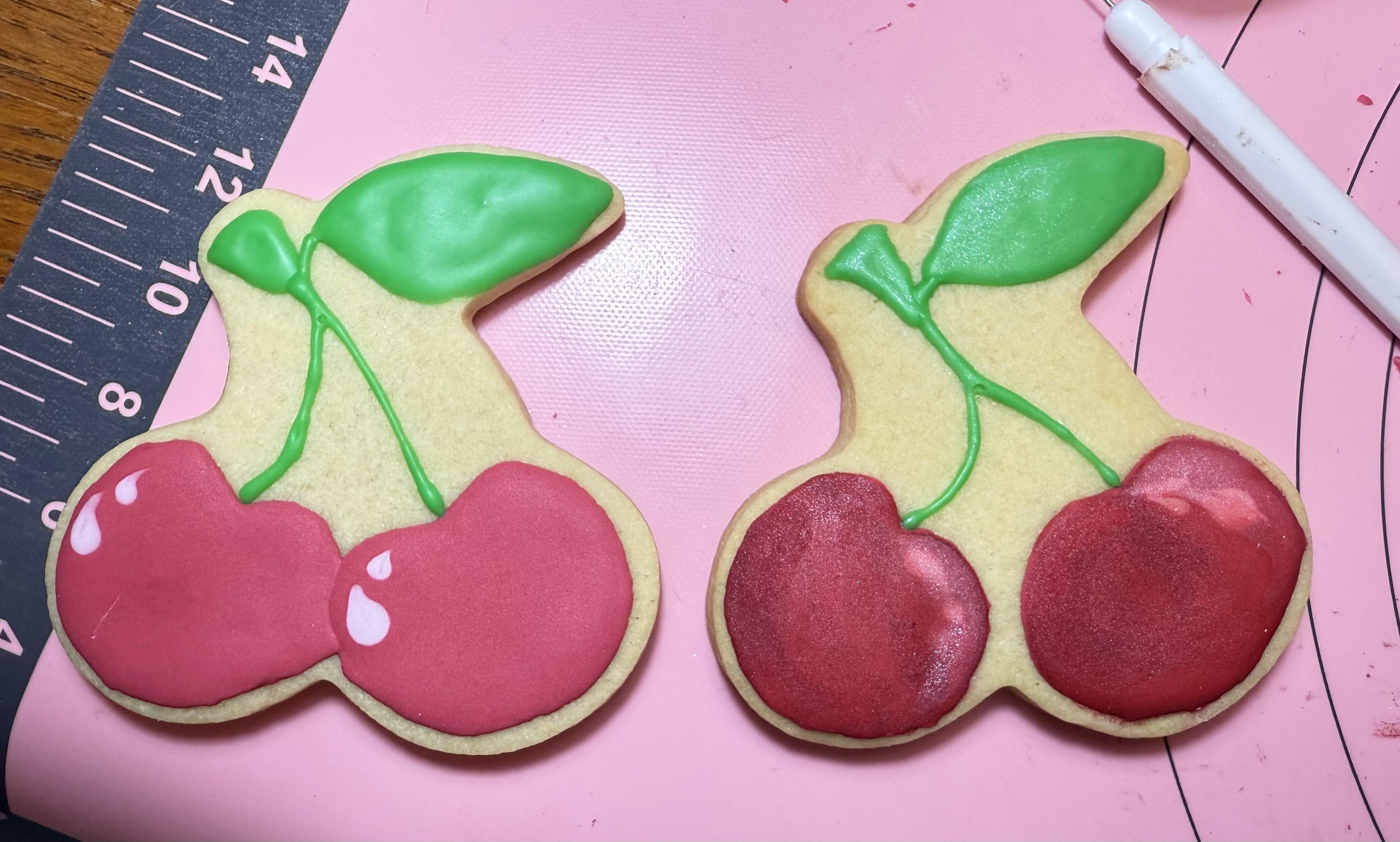 If you have the time I would do a white royal icing layer underneath – let it dry – and then add the cherries on top to make them pop more. They both look great! Depends on the look you’re trying to achieve…