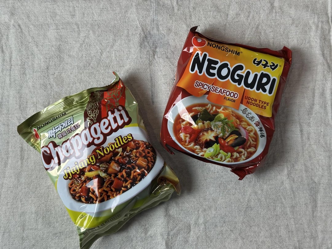 Mix in Jjapaghetti + Neoguri powders. Stir until noodles are glossy and saucy.