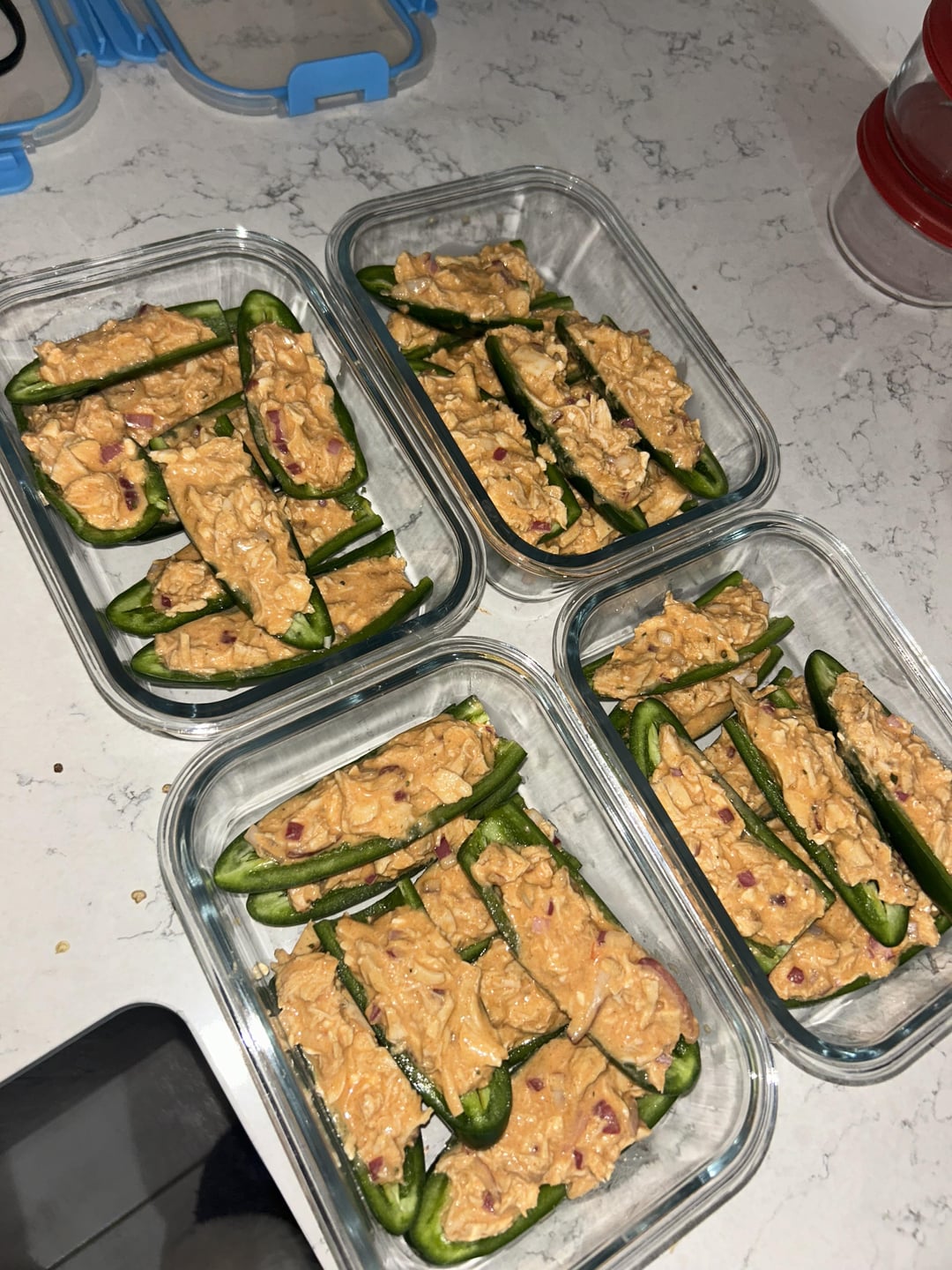 Meal prepped 32 poppers on Sunday to eat for lunches throughout the week. I reheat them in airfryer for 10 minutes before eating.
