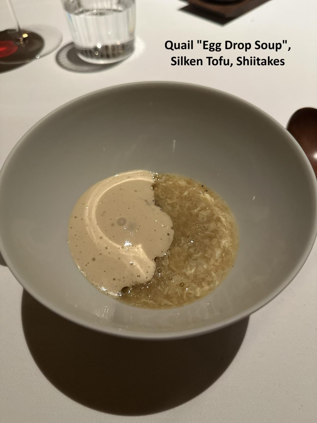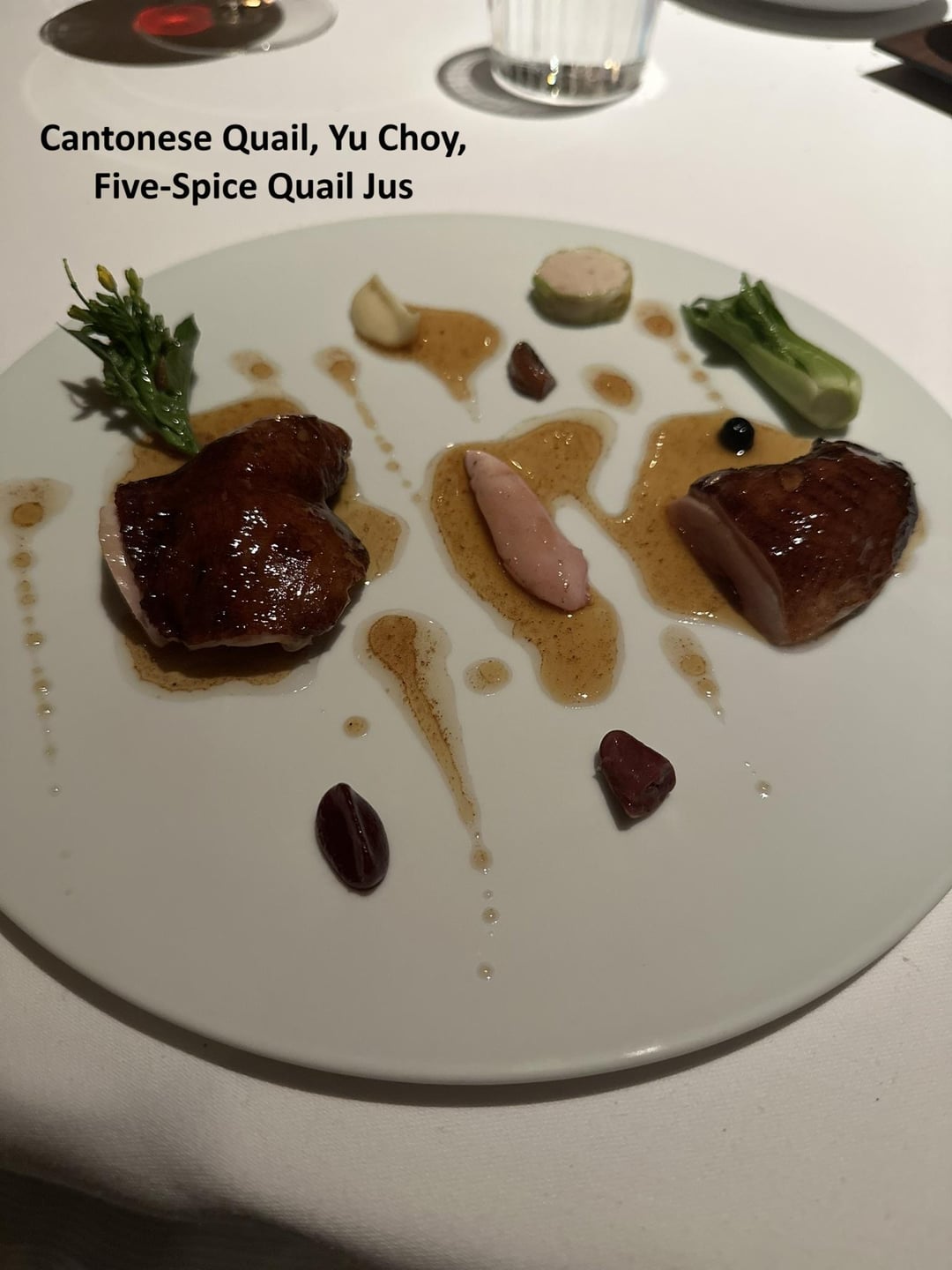 5) Quail egg drop soup and Cantonese quail – two dishes highlighting quail as the main entrée if one chooses to do away with the Wagyu substitution. While we were glad to try the Wagyu, I would have been more than happy for this quail dish to be the final entrée. It was quite comfortably the best poultry dish I’ve had on a tasting menu. It featured a piece of quail breast, loin and the leg, each spiced to perfection and accompanied by the deeply satisfying and flavorful jus and perfectly cooked vegetables. I had to switch plates midway so that my friend could try some of this too. I’d be lying if I said I wasn’t a little disappointed to give my plate away.