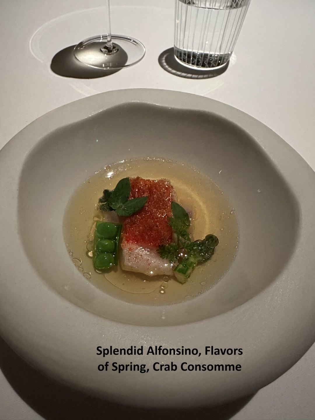 3) Splendid Alfonsino, flavors of spring, crab consommé – a constant theme of Addison’s main entrees is balance. Like the two that preceded this, a dish with perfect balance where each ingredient elevates the other. The fish, with soft meat but crisped up skin is perfectly complemented by the spring veggies. And that consommé with an intensely deep and comforting crab flavor, was a warm hug that rounded out each bite.
