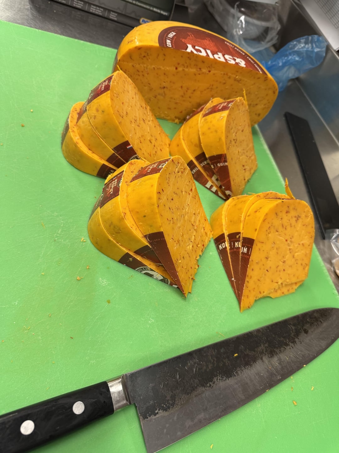Cutting up this Sambal flavor Gouda. As an Indonesian this feels weird but also feels so good.