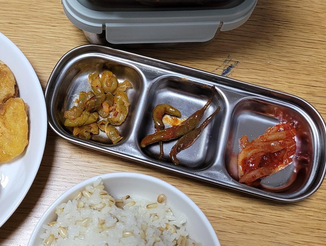 Here’s today’s meal! I just made the doenjang jjigae and cooked up some frozen fried snacks, but the squid jeotgal, pickled cucumbers, and seasoned chili peppers were side dishes I had stored in the fridge. It’s so convenient and tasty to have these ready—no need to worry about preparing side dishes every time!