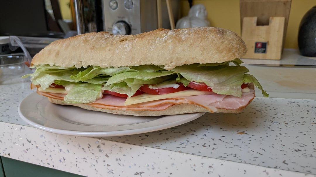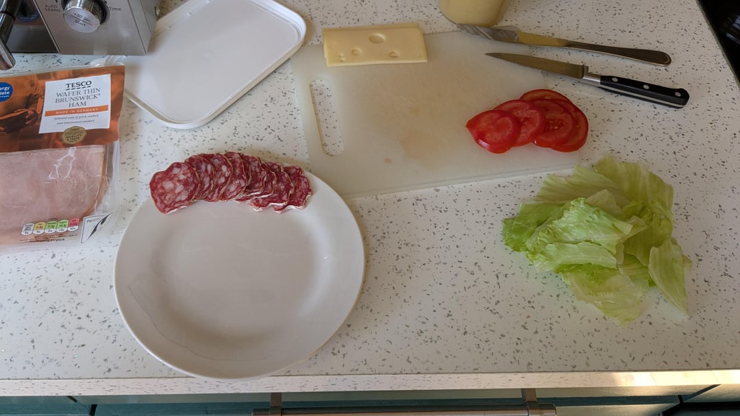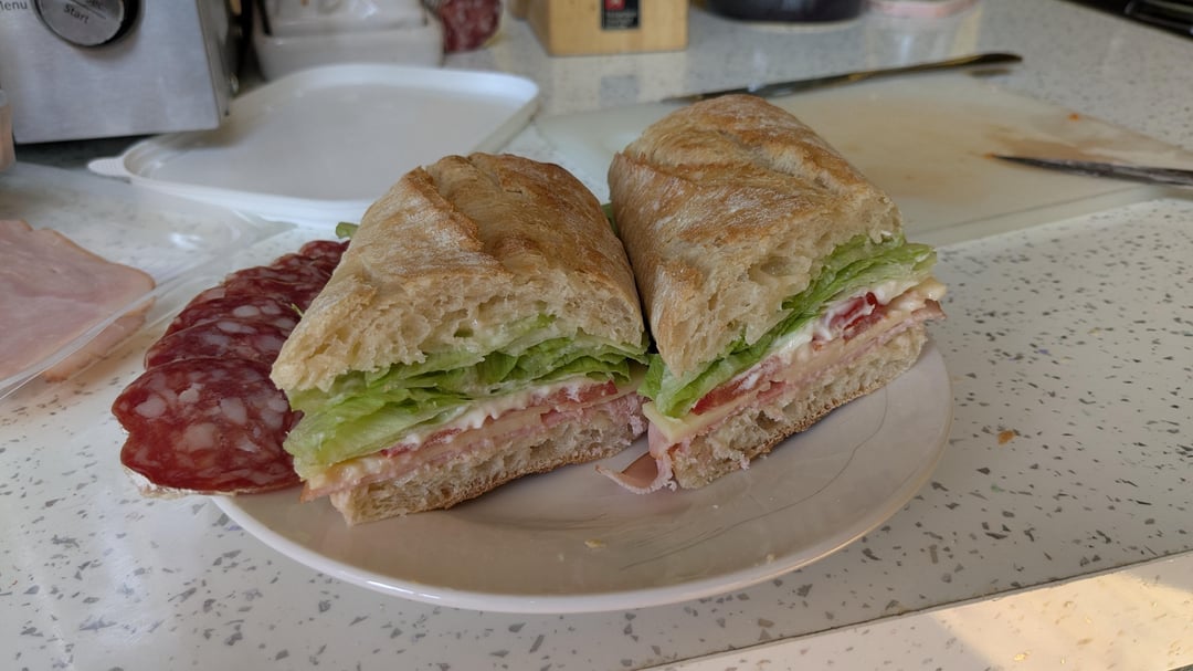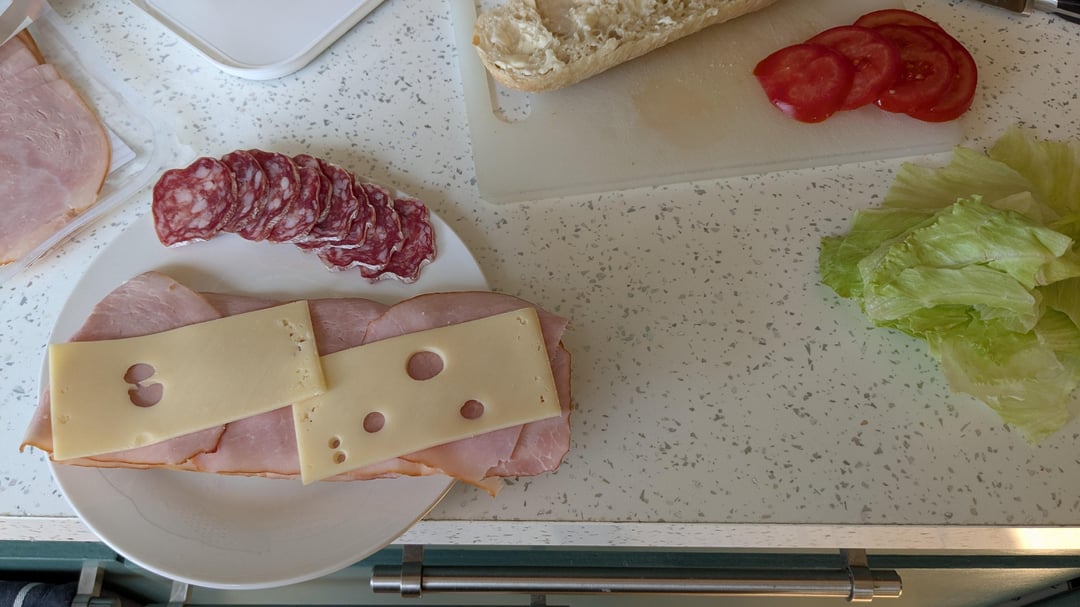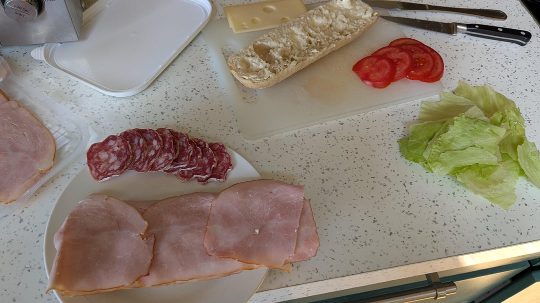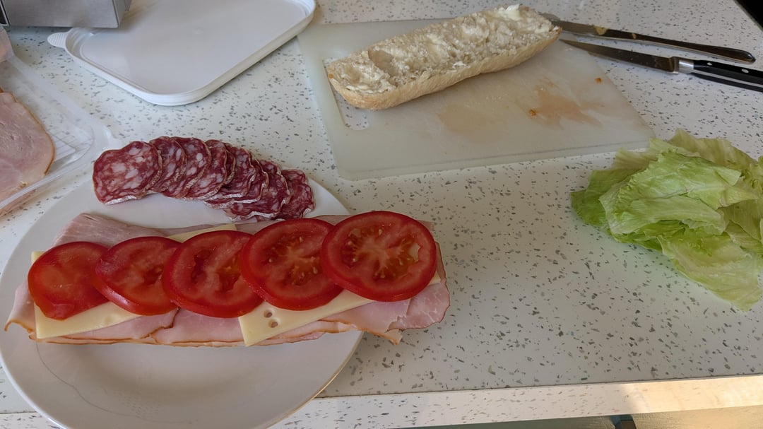 Fresh-baked buttered bread, smoked Brunswick ham, emmental, tomato, lettuce, mayo. Served with saucisson. by isalittledog Write A CommentYou must be logged in to post a comment.