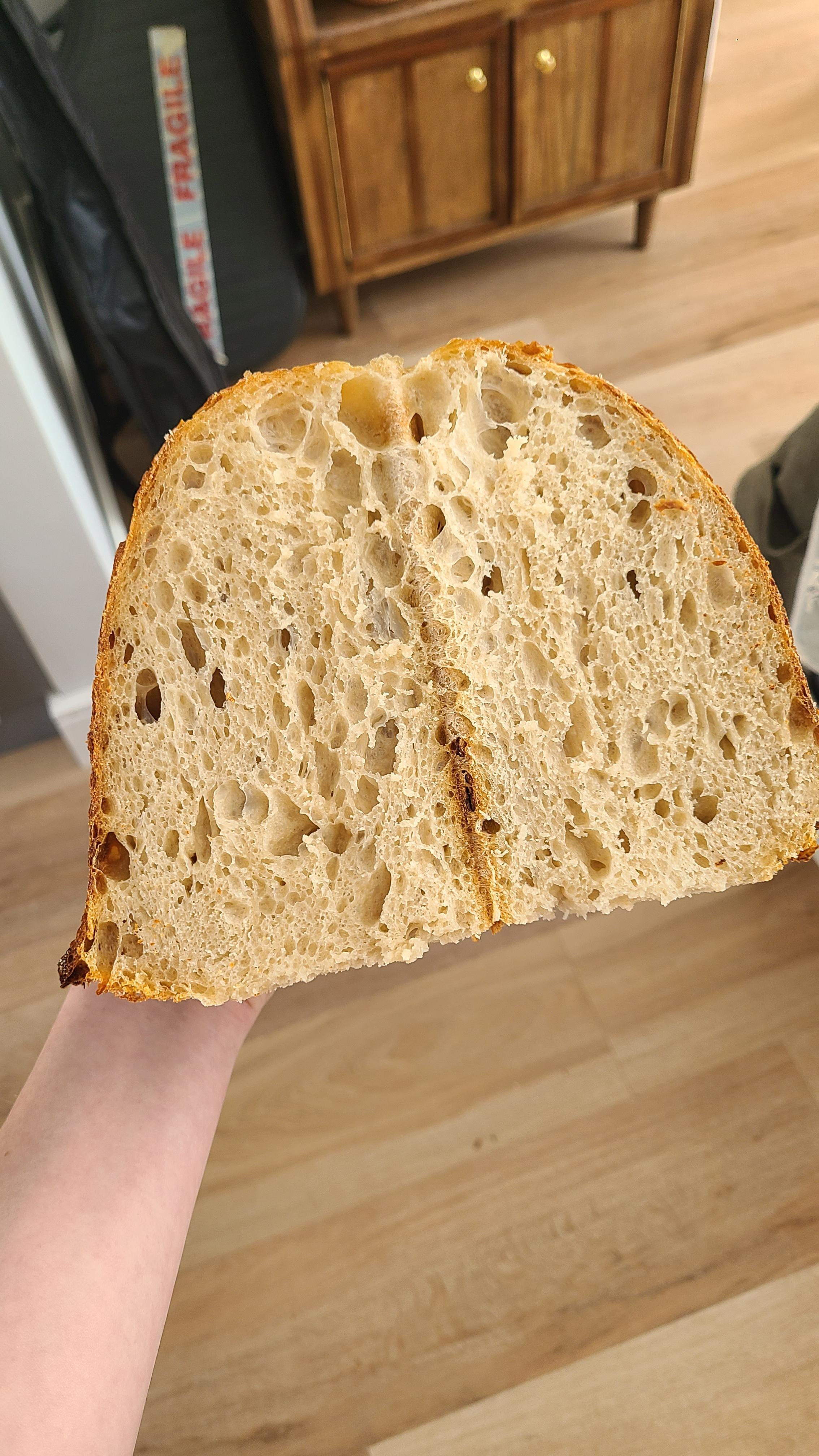 All mixed together at the start. Left for an hour. Four sets of stretch and fold half an hour apart ( I did more stretch and folds with each set compared to my previous attempts to help develop more strength). Total 11 hours bulk fermentation. 12 hours in the fridge. Baked at 220 in Dutch oven for 20 mins. 20 mins uncovered. Left the bread in oven to cool down with the door ajar (to see if it helped keep the crust crispy. It did!) Left to cool completely on the kitchen counter.