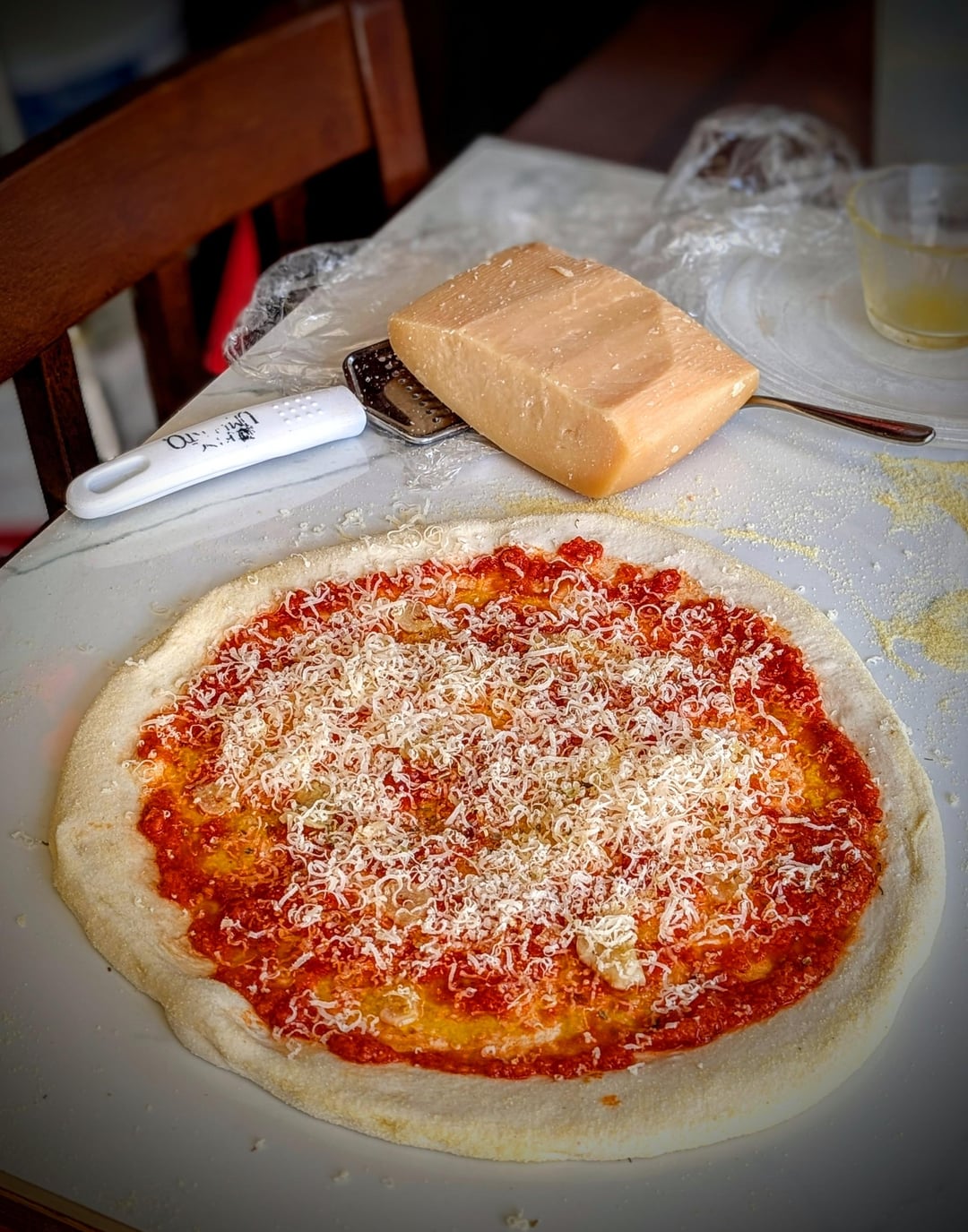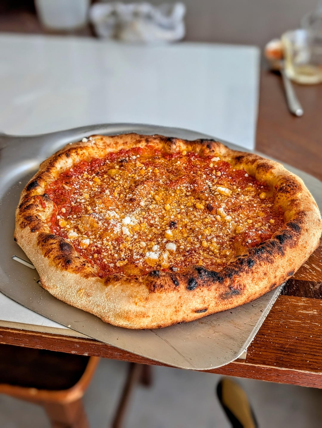 San Marzano, thin sliced marinated garlic, fresh grated Pecorino.
