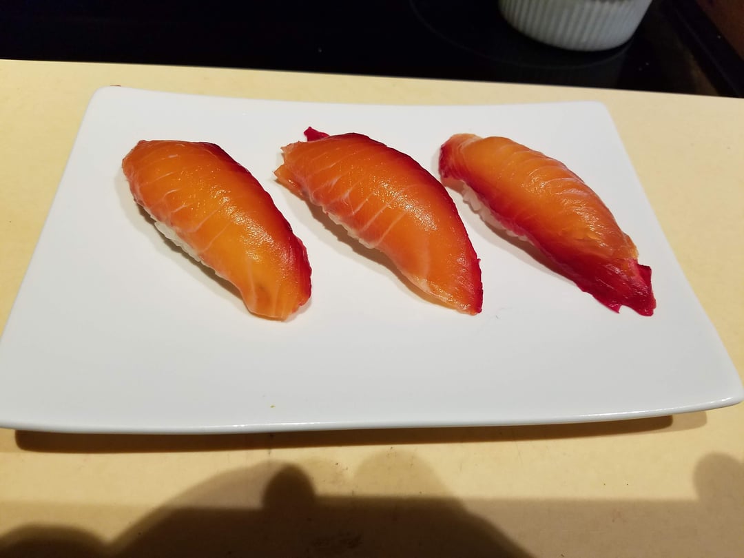 It works great for sushi and has a wonderful flavor. If you cure it with beets you can even get a neat two-tone color on it. The white fish is not homemade, just some hamachi I pulled out of the freezer.