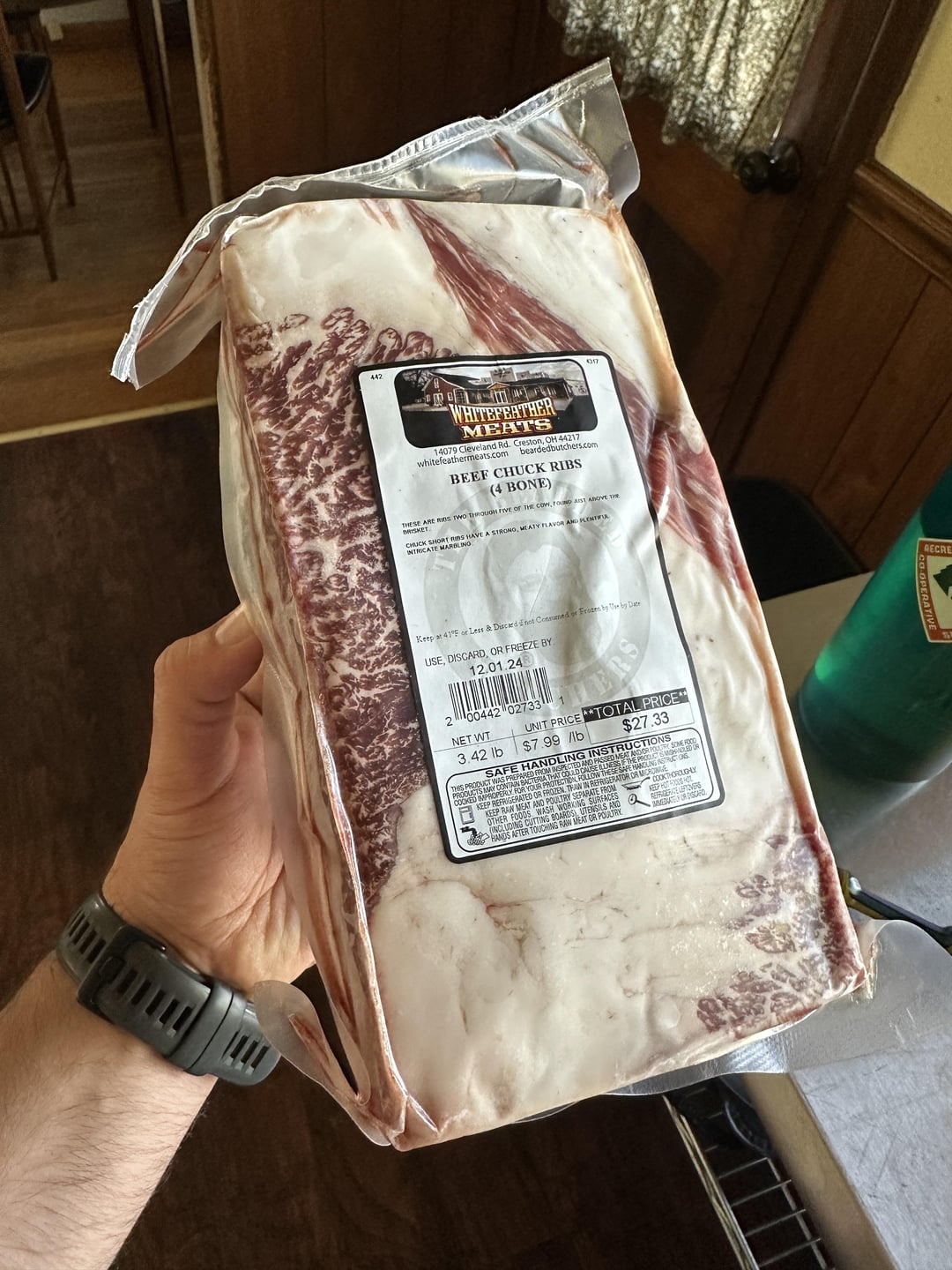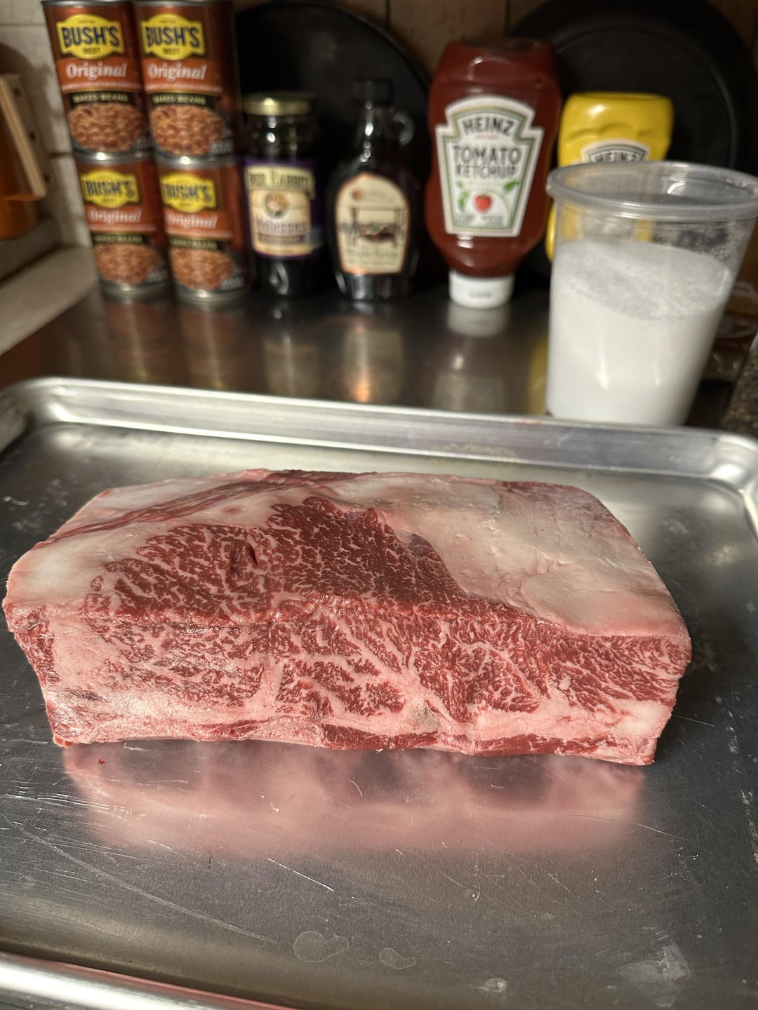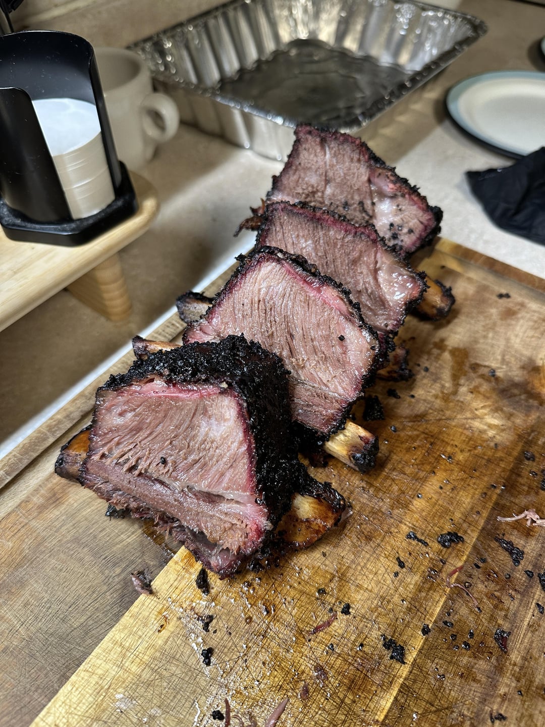 4 bone short rib, smoked @ 250 for 14 hrs with oak & cherry, spritzed with Frostop Red Birch Beer mixed with ACV. Super tender and juicy despite the photo looking somewhat dry. Couple of homemade sauces to go with and smoked baked beans. Haven’t figured out what to call those yet..