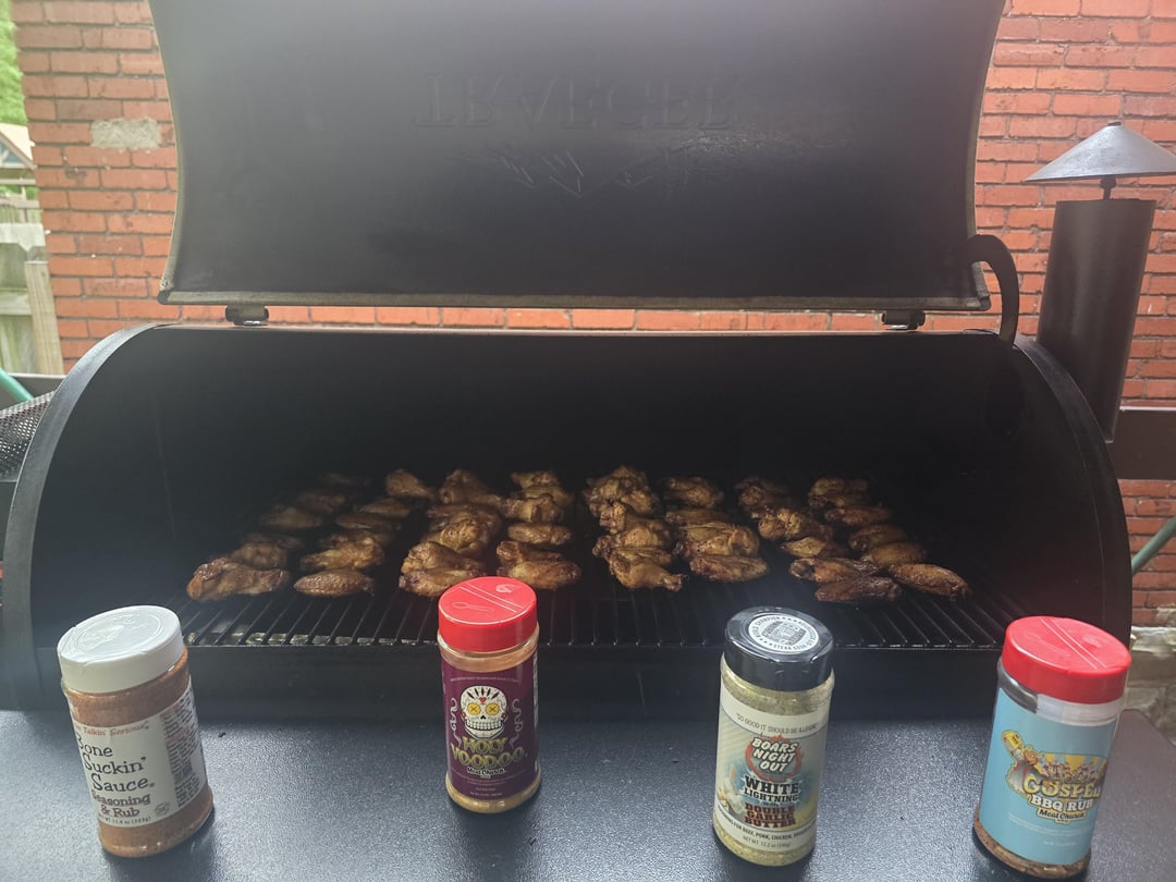 Hey me too! I did a rub of paprika, garlic, onion, s+p, chili powder, cumin and cayenne. Going to finish some with lemon pepper and some with franks and butter