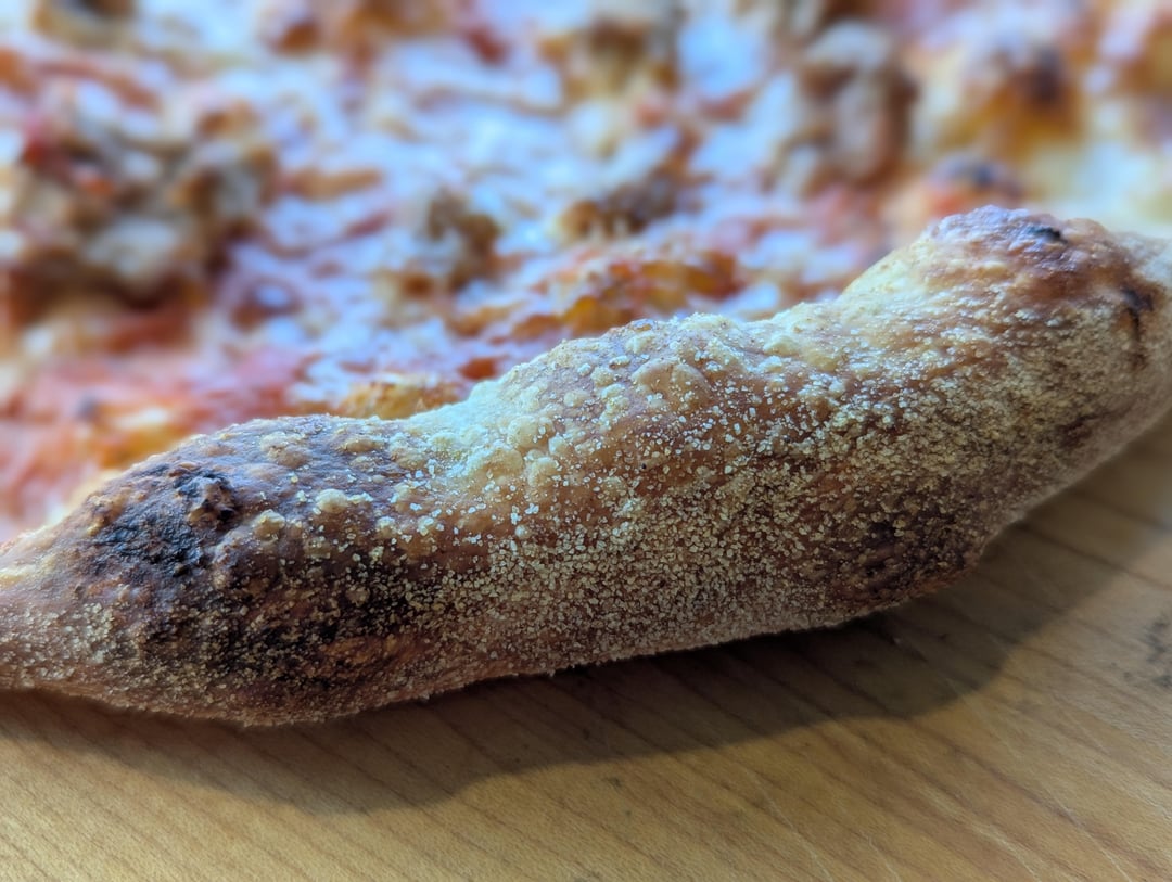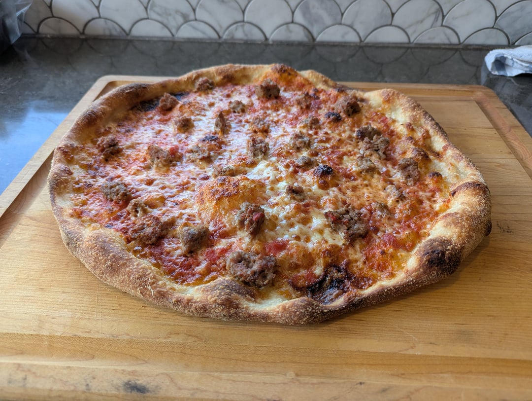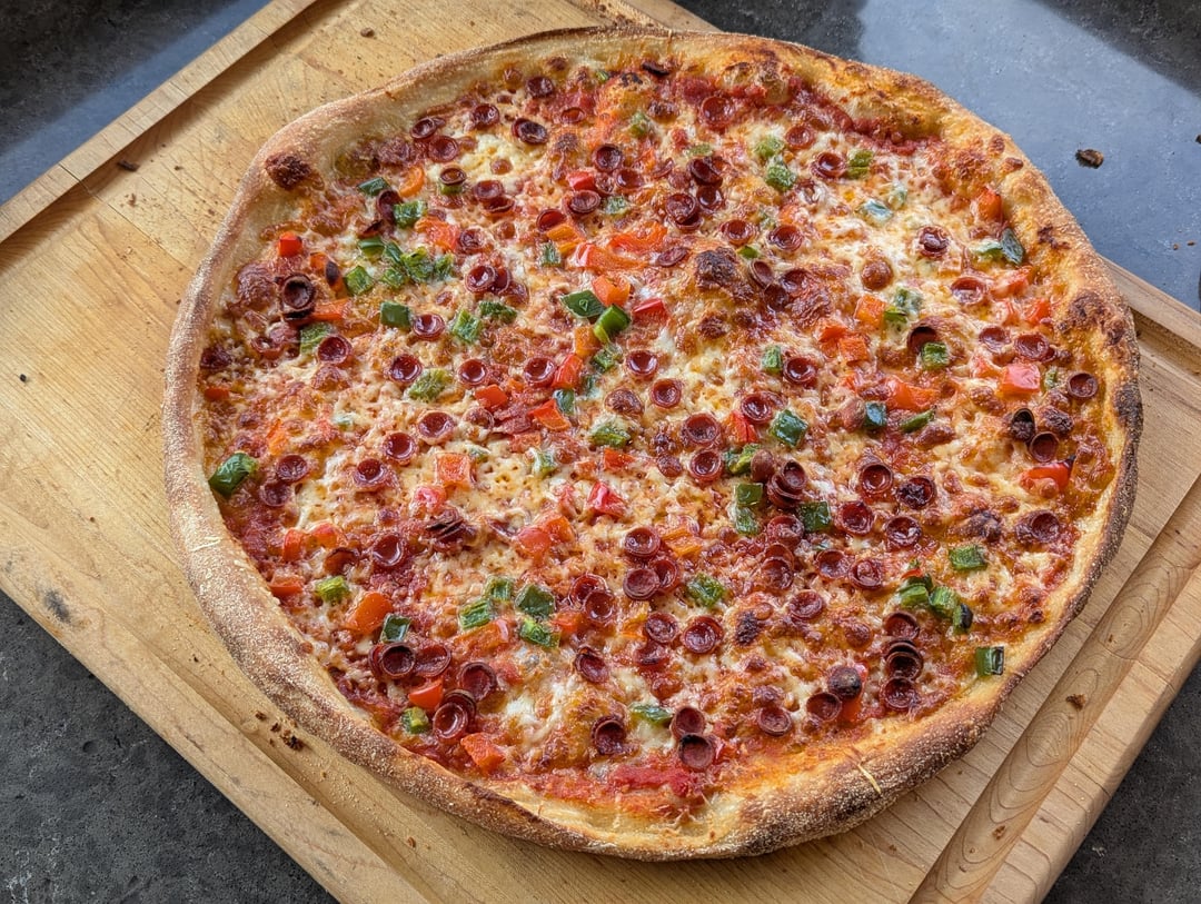 60% hydration, 3% salt/oil, 24hr room temp ferment. I did a 380 g dough ball for a 15" pizza.