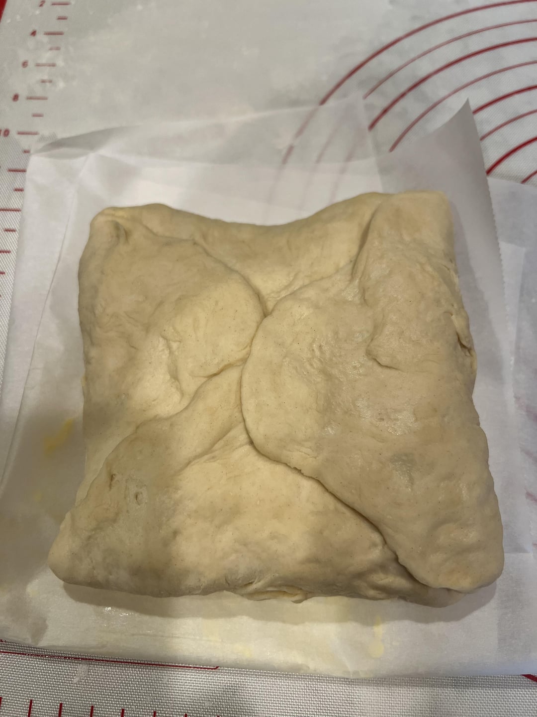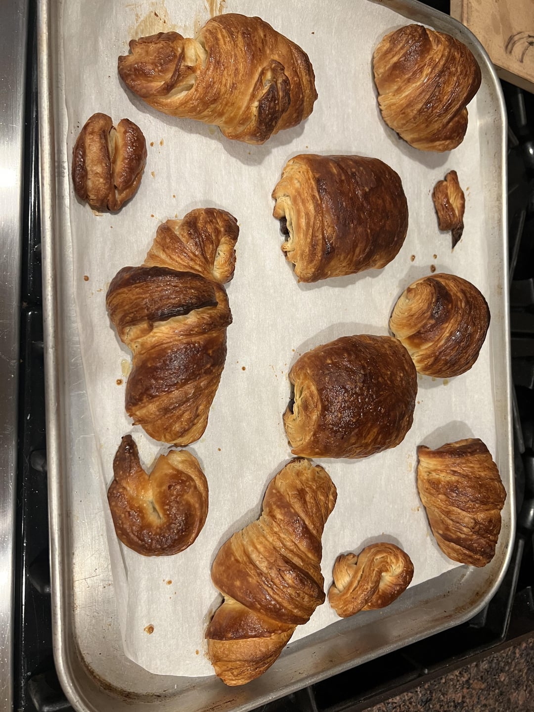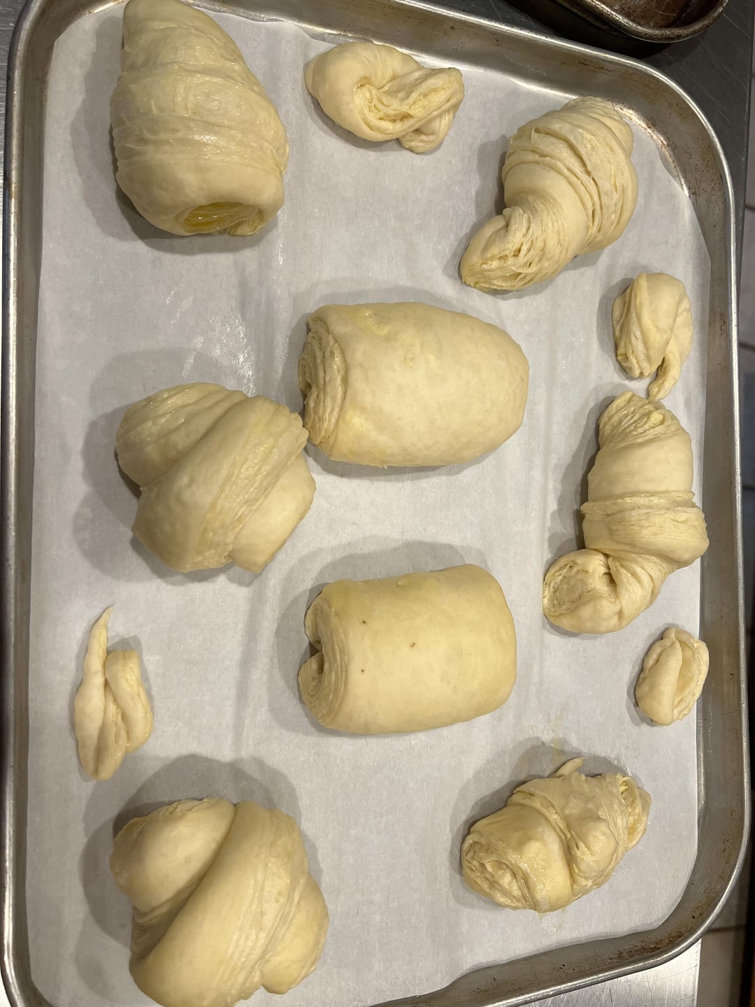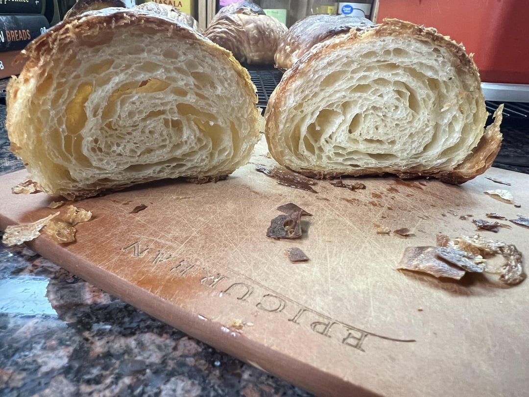 I took King Arthur’s “Lofty Layers” Zoom class last week and loved it. They did a great job with this format. I’d made laminated dough a couple of times but it had issues (mainly butter leakage), and took the class to fix it. It did! Here are my results; they were delicious. My shaping technique has room for improvement, and it’s a good thing these were only for me. On the baking sheet: