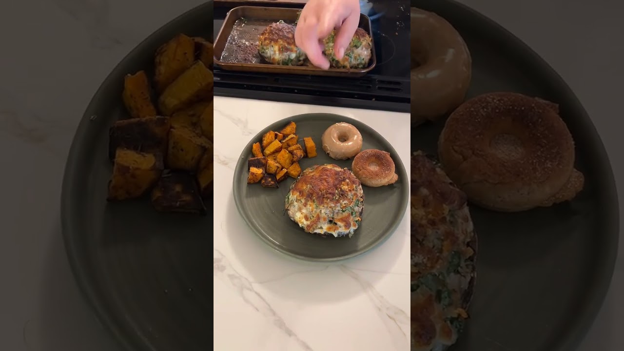 We have our roasted um sweet potatoes that are in basil and oregano and garlic salt. Our Italian stuffed mushrooms with spinach, mozzarella cheese, Italian sausage, pork, lots of seasonings. And then our cinnamon sourdough discard donut with a brown sugar cinnamon glaze and a cinnamon sugar topping to