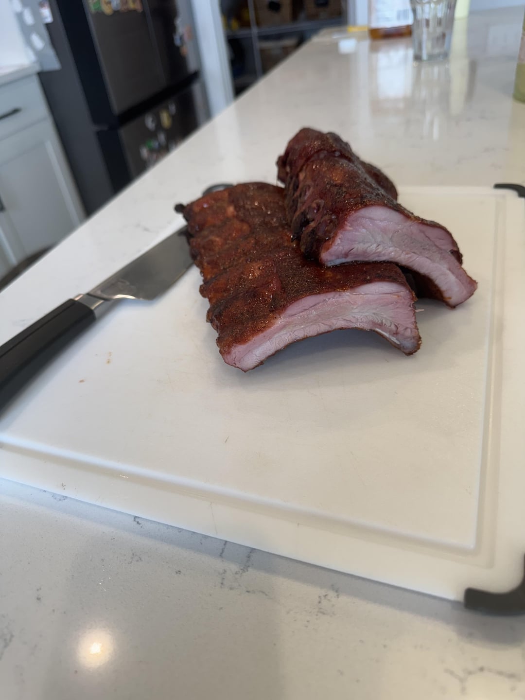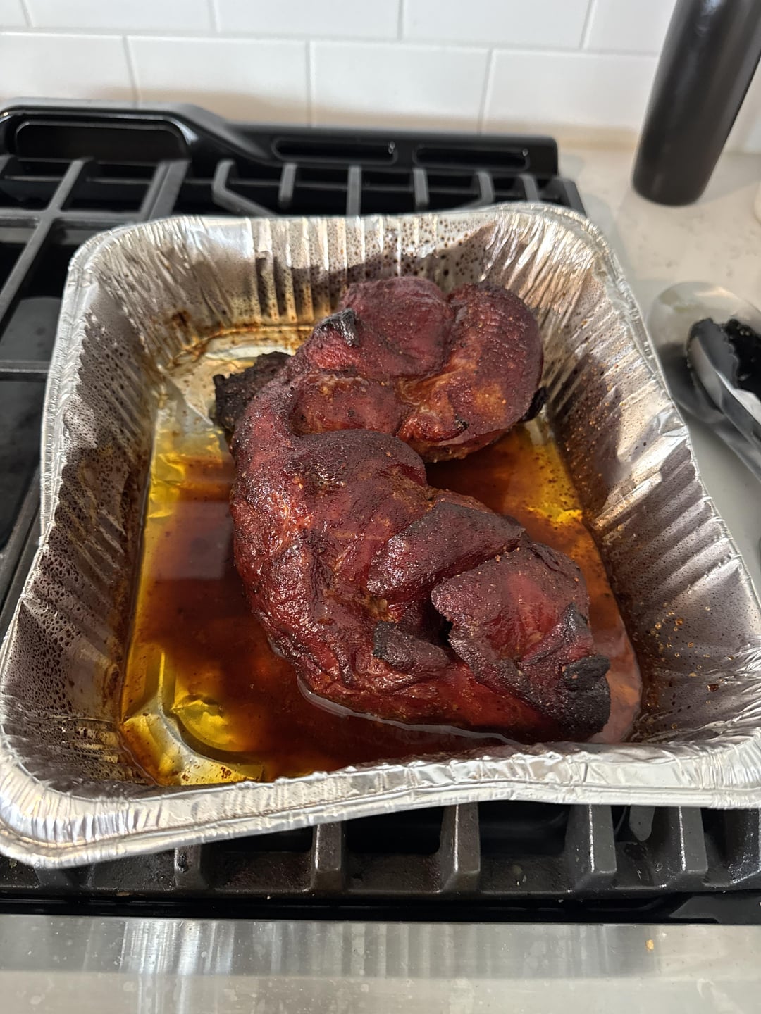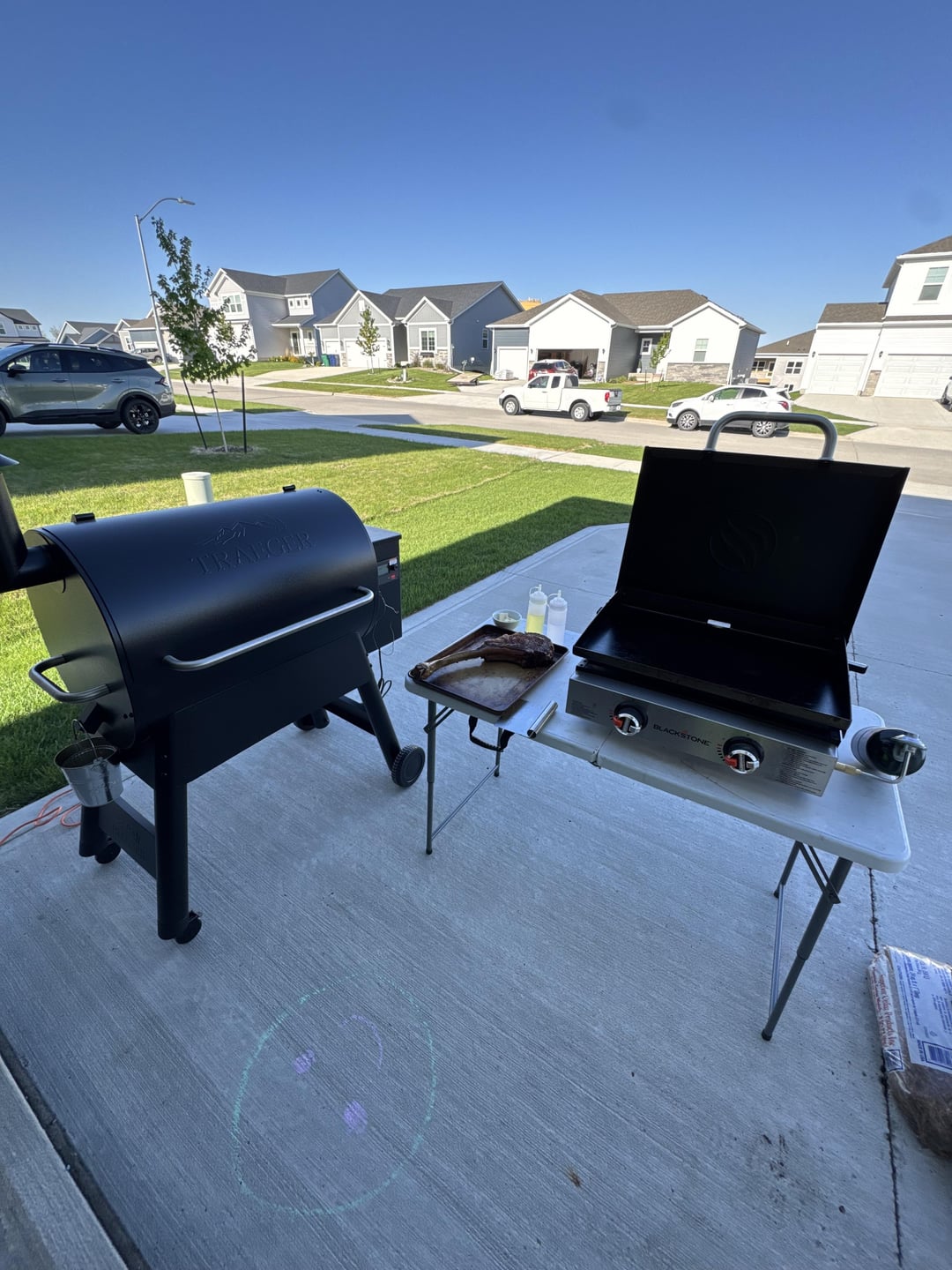 Ribs – 2.5-1-1 method, homemade dry rub, spritzed with apple juice, wrapped in foil, local BBQ sauce Chicken – spatchcock, homemade dry rub, threw it on as the ribs finished Pork butt – Meat Church recipe (honey hog rub, spritzed with apple juice). Had to crank it to finish the meat to appease a hungry toddler, so didn’t shred as nicely as I’d hoped Tomahawk – Holy Cow rub, 225 until 125, seared on blackstone with butter and garlic. Rest 20 mins.