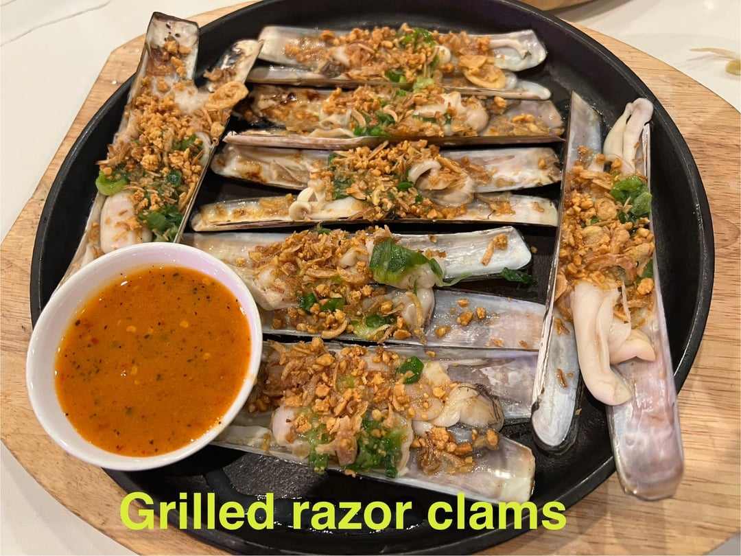 1. Grilled razor clams, sprinkled with crunchy niblets (I think fried garlic and/or shallot) and scallions, served with a delicious sauce that was spicy and a tad funky, but not overpowering. They were also easy to eat, no prying them out of the shell necessary.