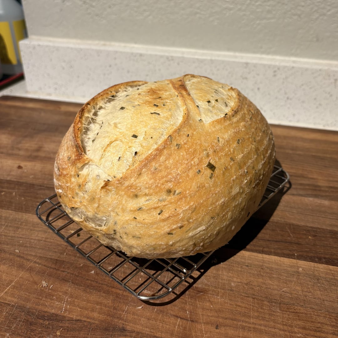 Despite the water fiasco, the loaf turned out really nice. The crust is thin and crackly and tastes cheesy like you'd want. No real changes I'd make for next time save for switching to a single ice cube in the combo cooker instead of two. If that ends up being too much, then I'll stick with just the misting.
