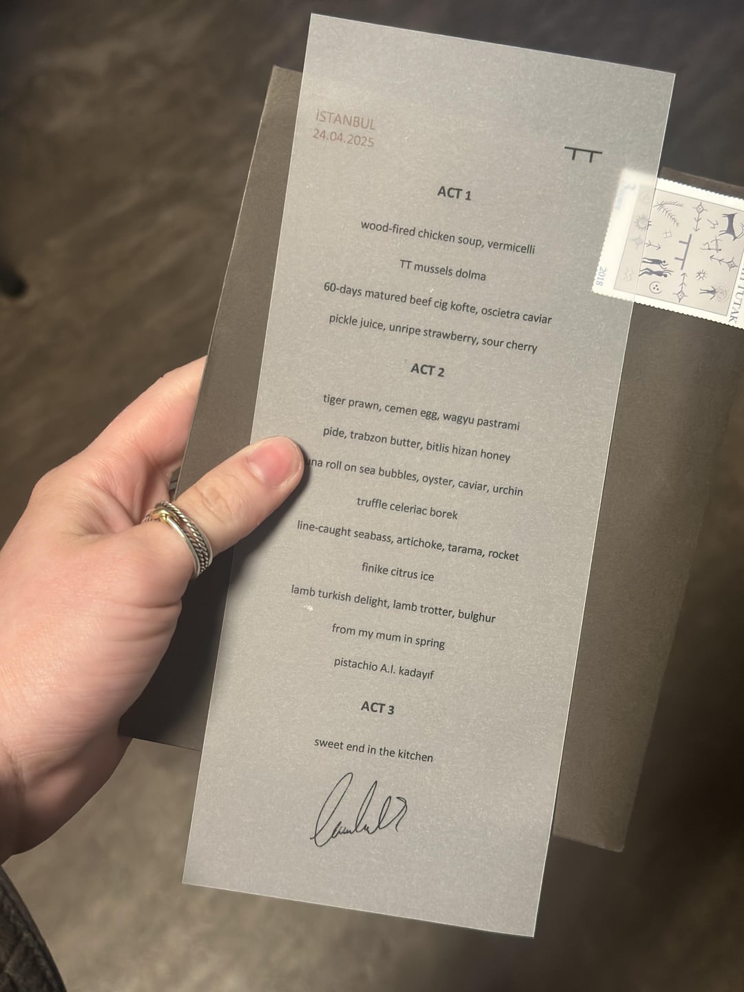 I went there in Nov 2023, and it was incredible! Solo dined at the chef counter, and the chefs interact with you on the pass. The chef who did my kitchen tour ended up being on Master Chef Turkiye 2024, which was pretty cool lol