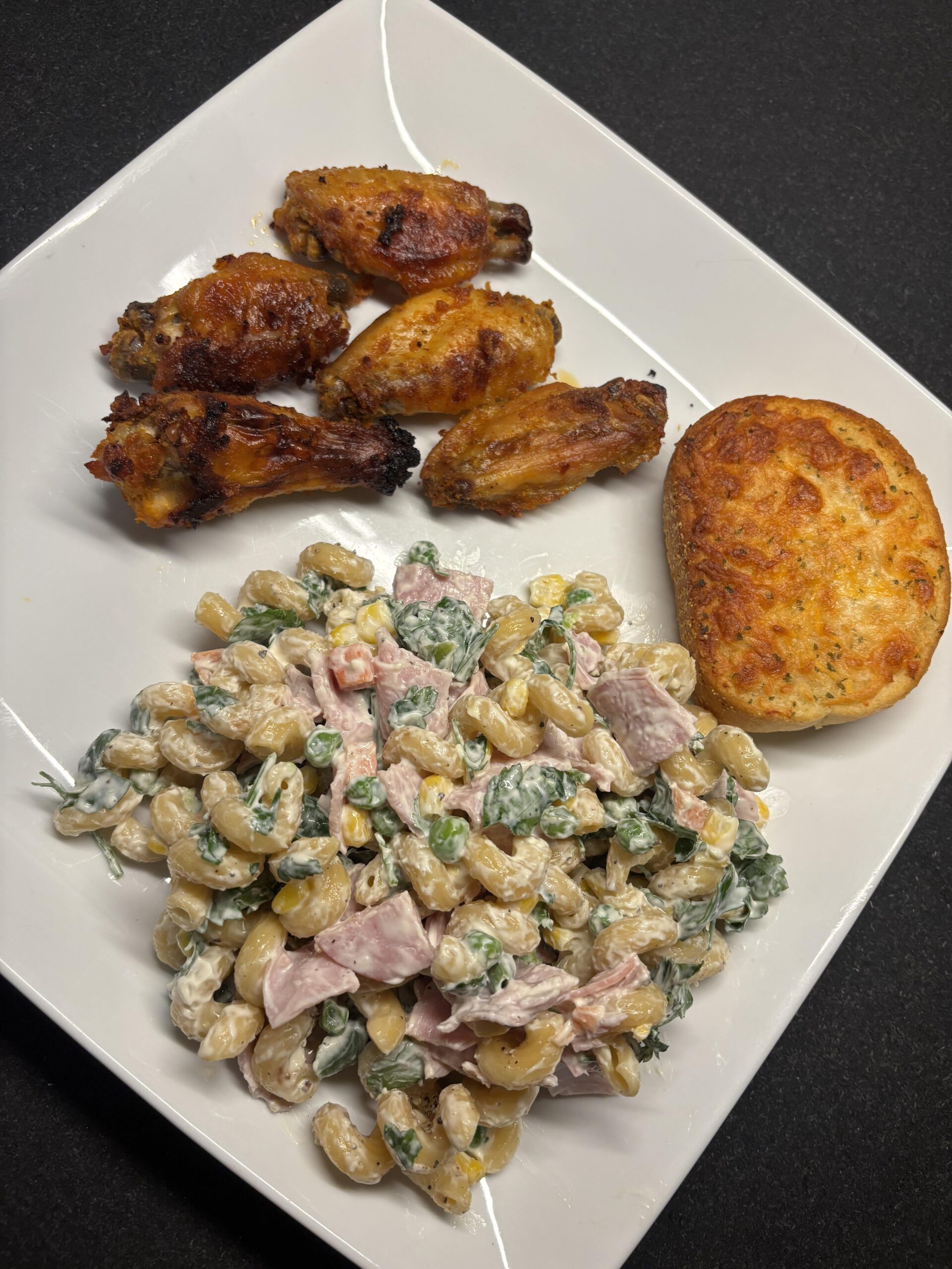 Baked then Air fried, Paired with pasta salad & texas toast 🩵