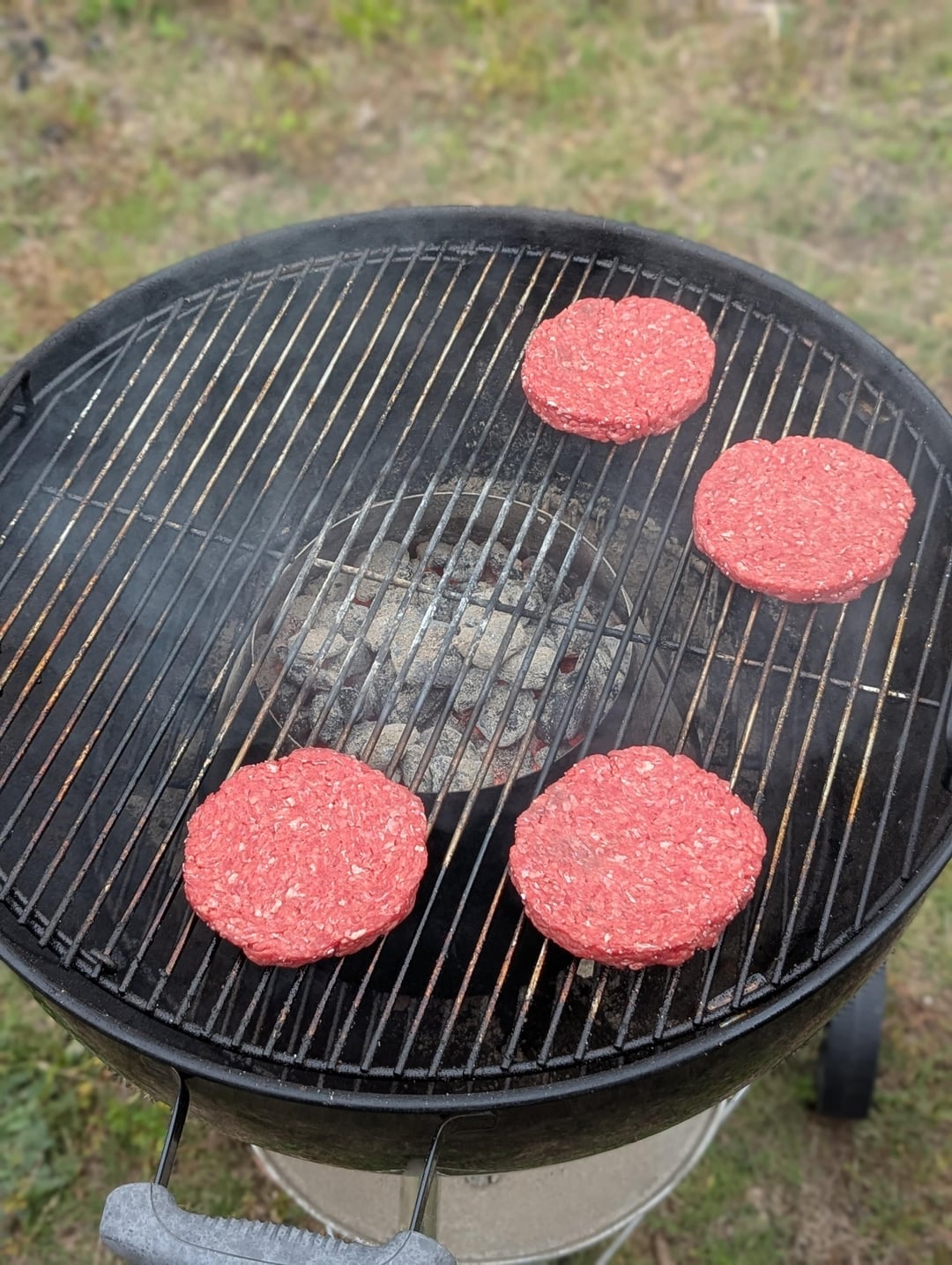 I start by cutting pieces of wax paper to form the patties on. I put a piece on the scale, weight out portions of 100% ground beef for patties (this is 80/20 ground chuck), 4 oz (~113.5g) is usually a pretty good size for most people. If someone wants to go wild, they can just double up on patties. Then, I form the patties right on the wax paper, on top of a cutting board so it's against something flat. I don't know how much it shows in the picture, but I make them a bit concaved. I'll roughly round it out, flip, then complete the rounding. I try to avoid overworking or compacting them too much; We're making burger patties, not meatloaf. I salt one side when they're formed, and I'll salt the other side after I place them on the grill.