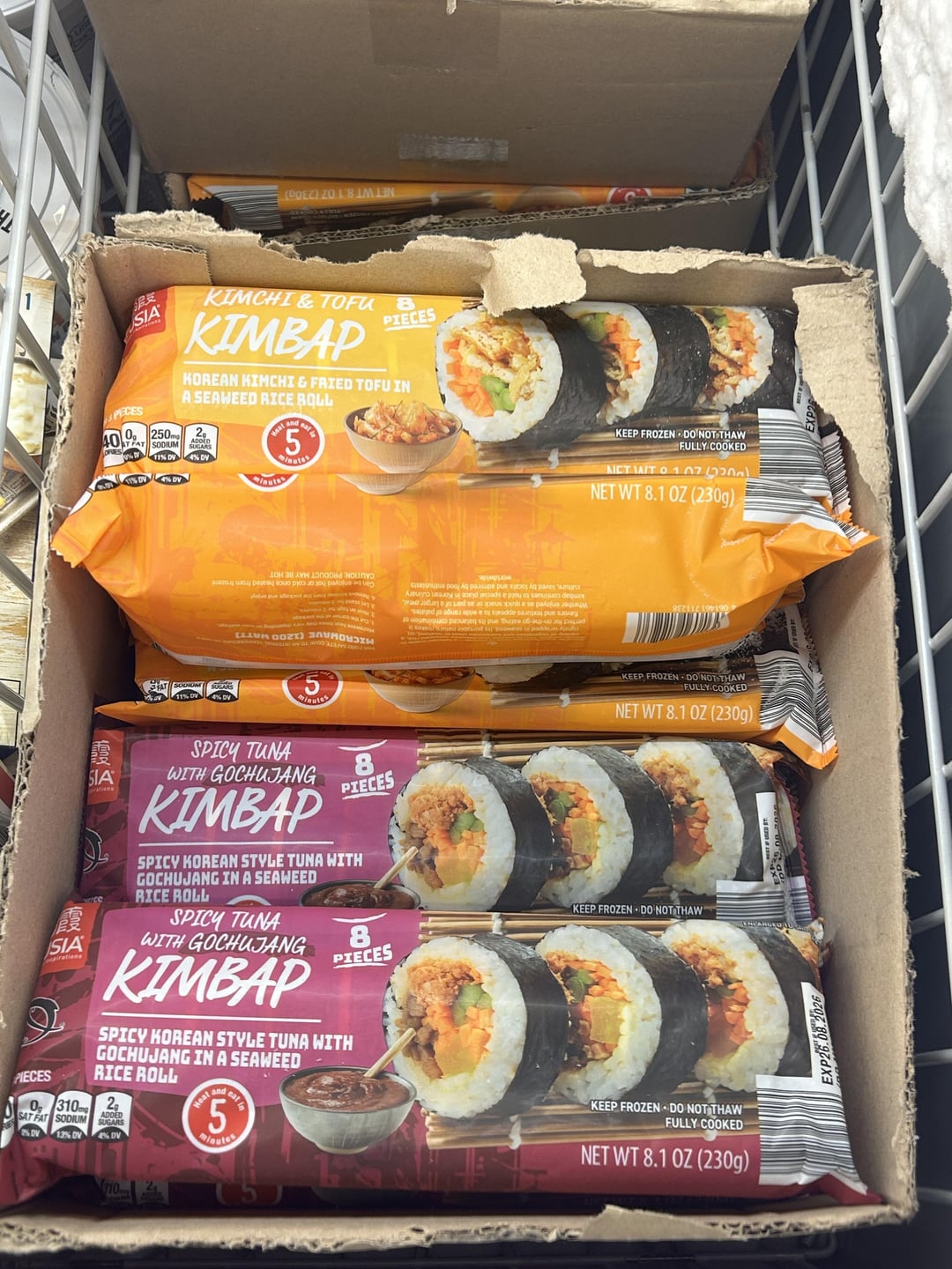 I cannot understand how frozen kimbaps are a hit anywhere. I tried it once from Costco and hated it. The seaweed was soggy and the spinach in it made it smell horrible. I refused to eat more than one bite.