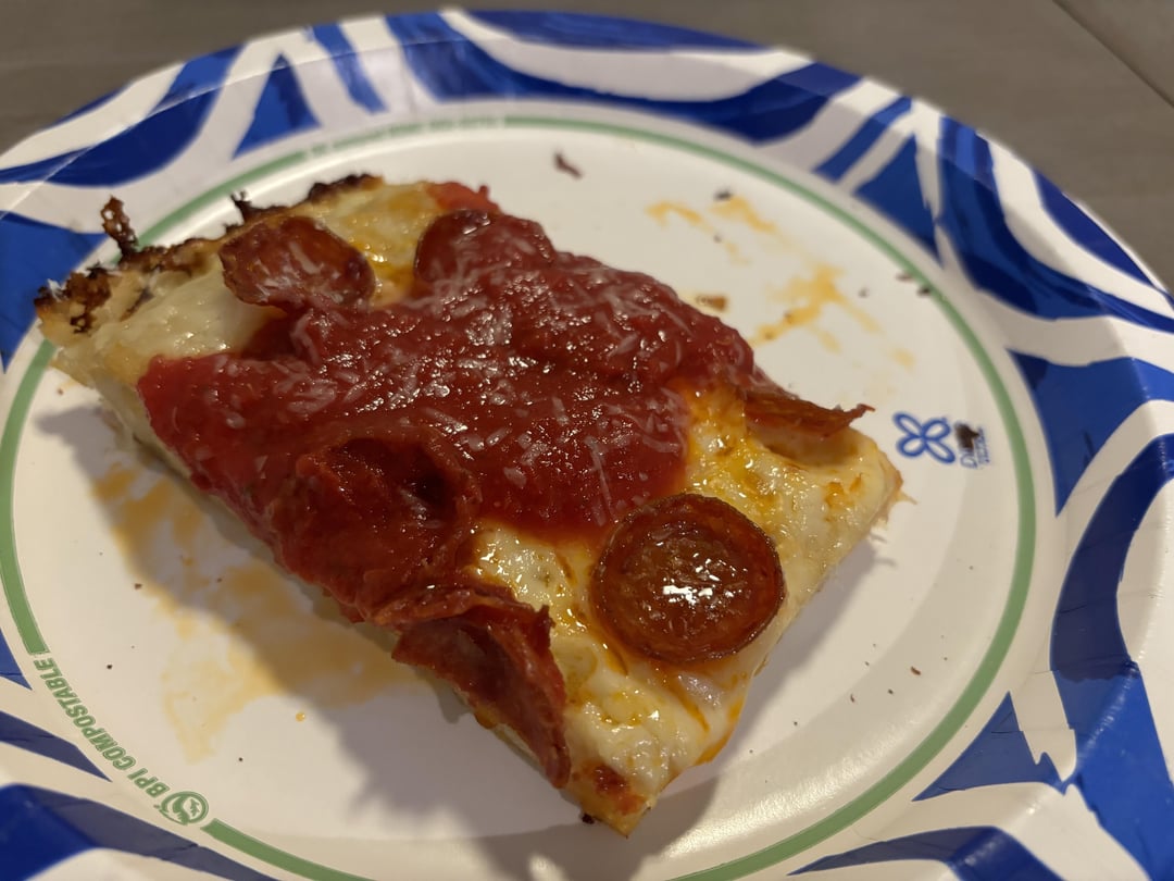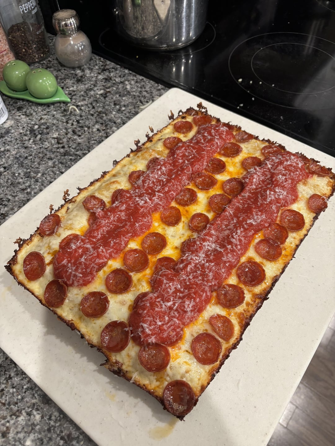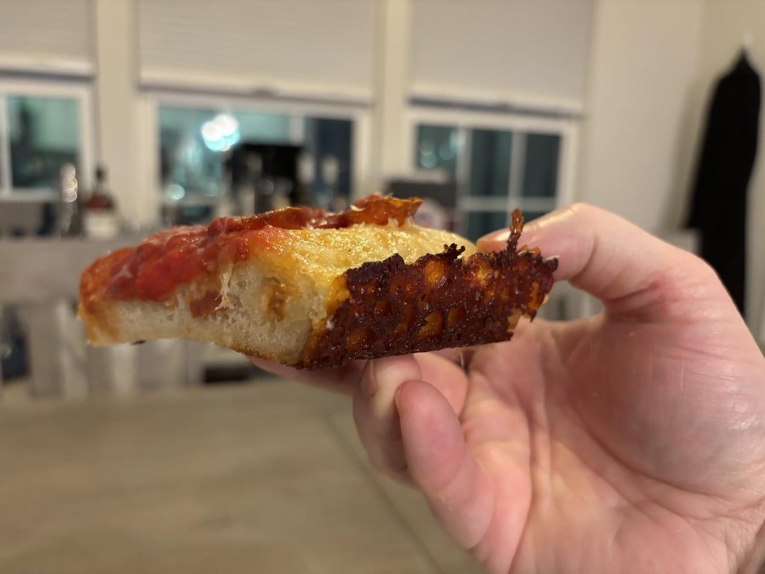 Made my first ever Detroit-style pepperoni pie. How’d I do? For those of you that do this style, any tips or tricks? Do you put the pans on your baking steels? I’d like to get a little more crisp/oven spring next time