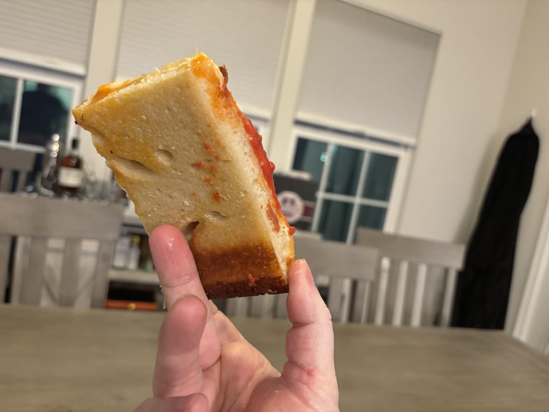 Not too bad overall, what I would work on is the density. More air bubbles, bigger air bubbles, light and fluff. This is what Detroit is all about (besides the edges of course) The best way to do this I’ve found is 2 things really. 1. High hydration – aim for 80-85% 2. Proof proof proof! Proof is in the pudding – your dough should be risen well over half way into the pan. Let it proof in the pan for 4-6 hrs before bake, depending on temp.