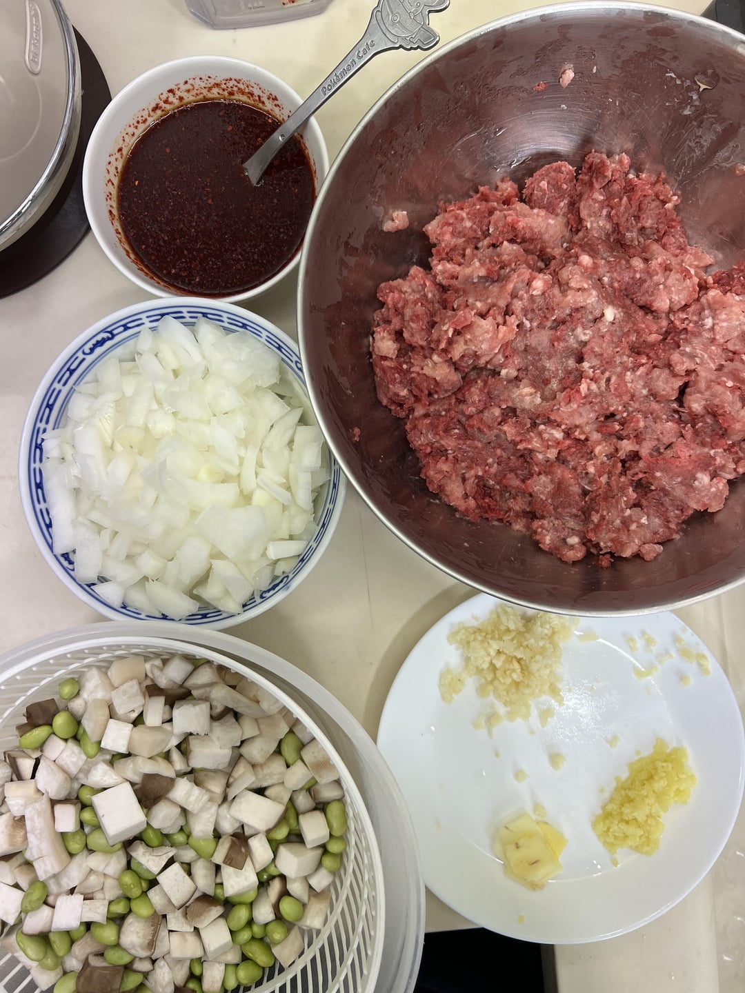 Some differences I had from the video – I used a mix of minced pork and beef (50/50) – I marinated the meat beforehand with cooking wine, a bit of soy sauce, and cornstarch to get rid of some of the gamey smell – Added edamame and diced mushroom, they were added in after sweating down the onions
