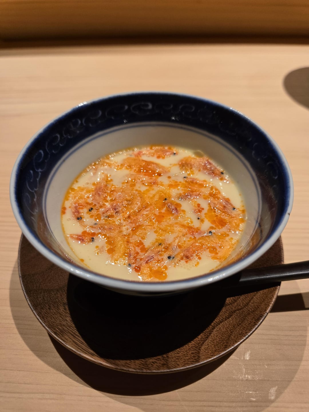 -chawanmushi, sakura ebi. Oil from the sakura ebi overpowered the chawanmushi.