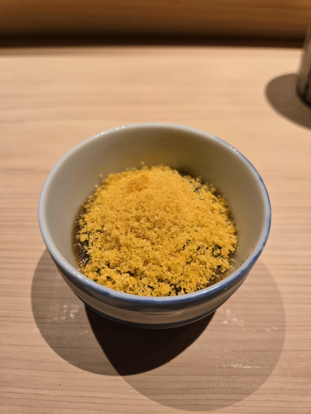 -mozuku "somen", shaved karasumi. Believe this was futo mozuku, the textureless variety, plain in taste. I prefer mozuku when it has a stringy and snappy texture, the vinegared ones. Seems the shaved karasumi here was going for that pasta emulsification effect. Didn't come together.