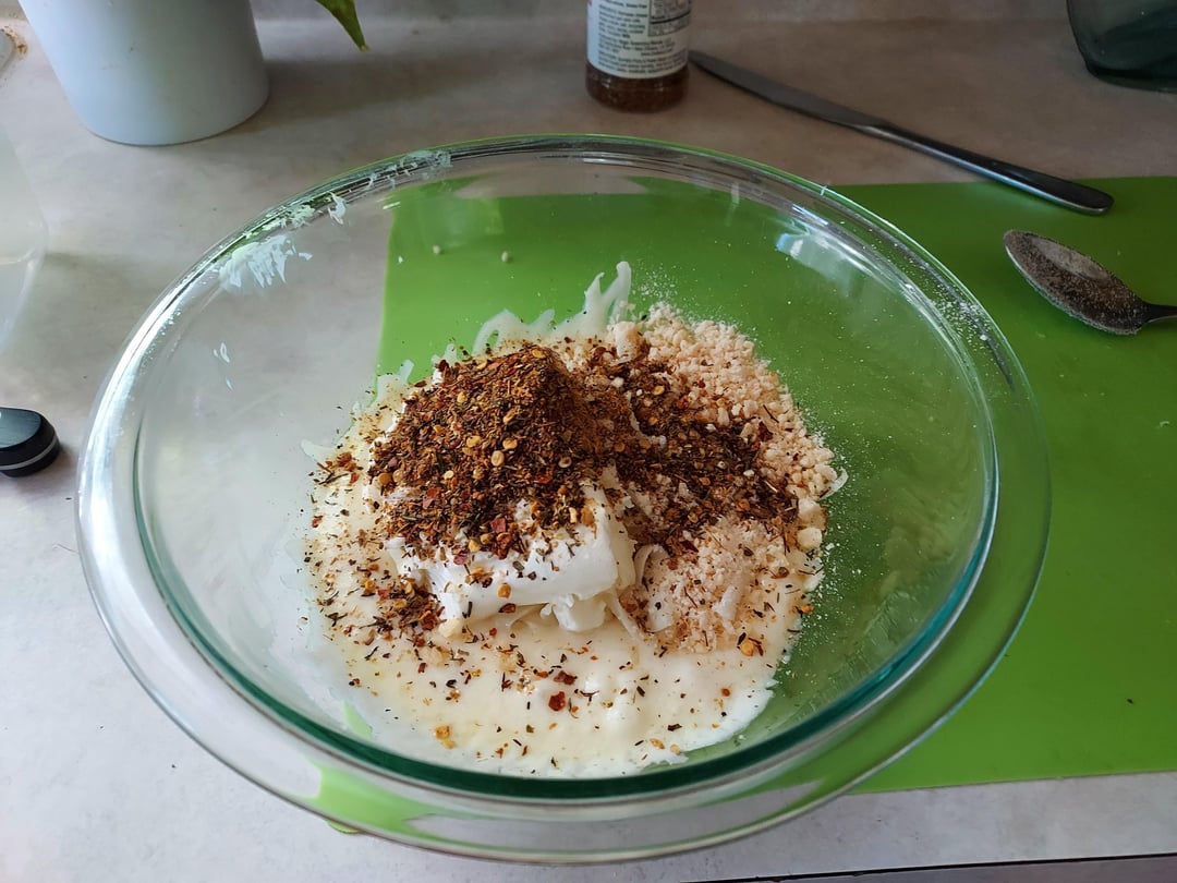 1. Microwave 1/2 lb mozzarella, 1/2 block cream cheese, 2 Tb parmesian for 60 sec. Add 1 egg and blend well. Add 3/4 c almond flour, 1/4 c coconut flour and spices to form dough.
