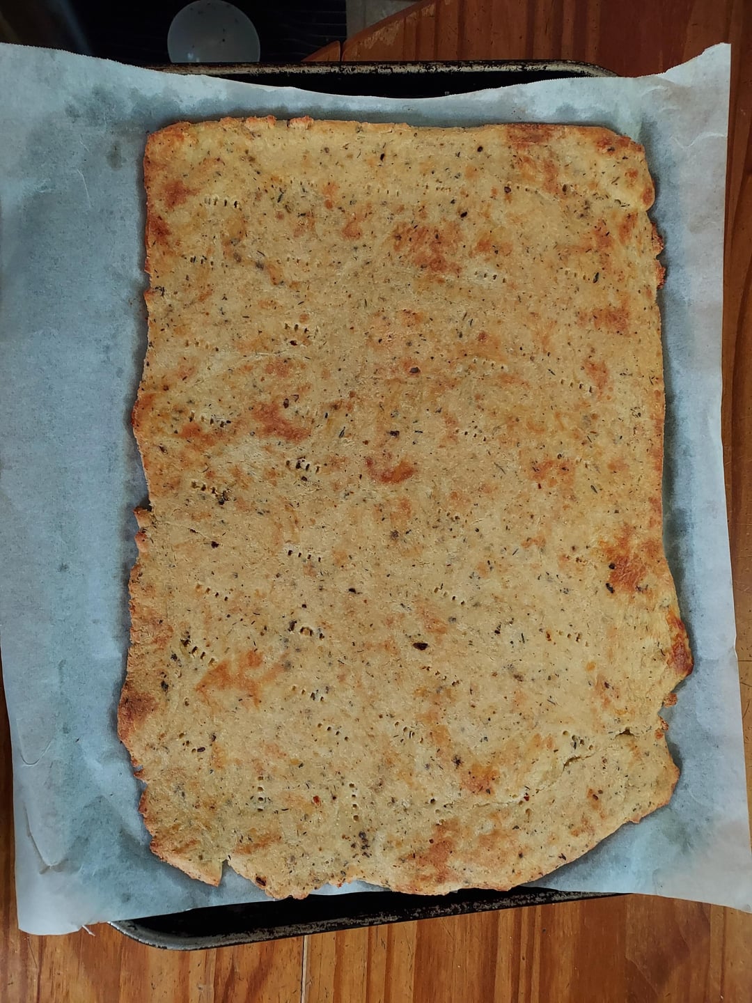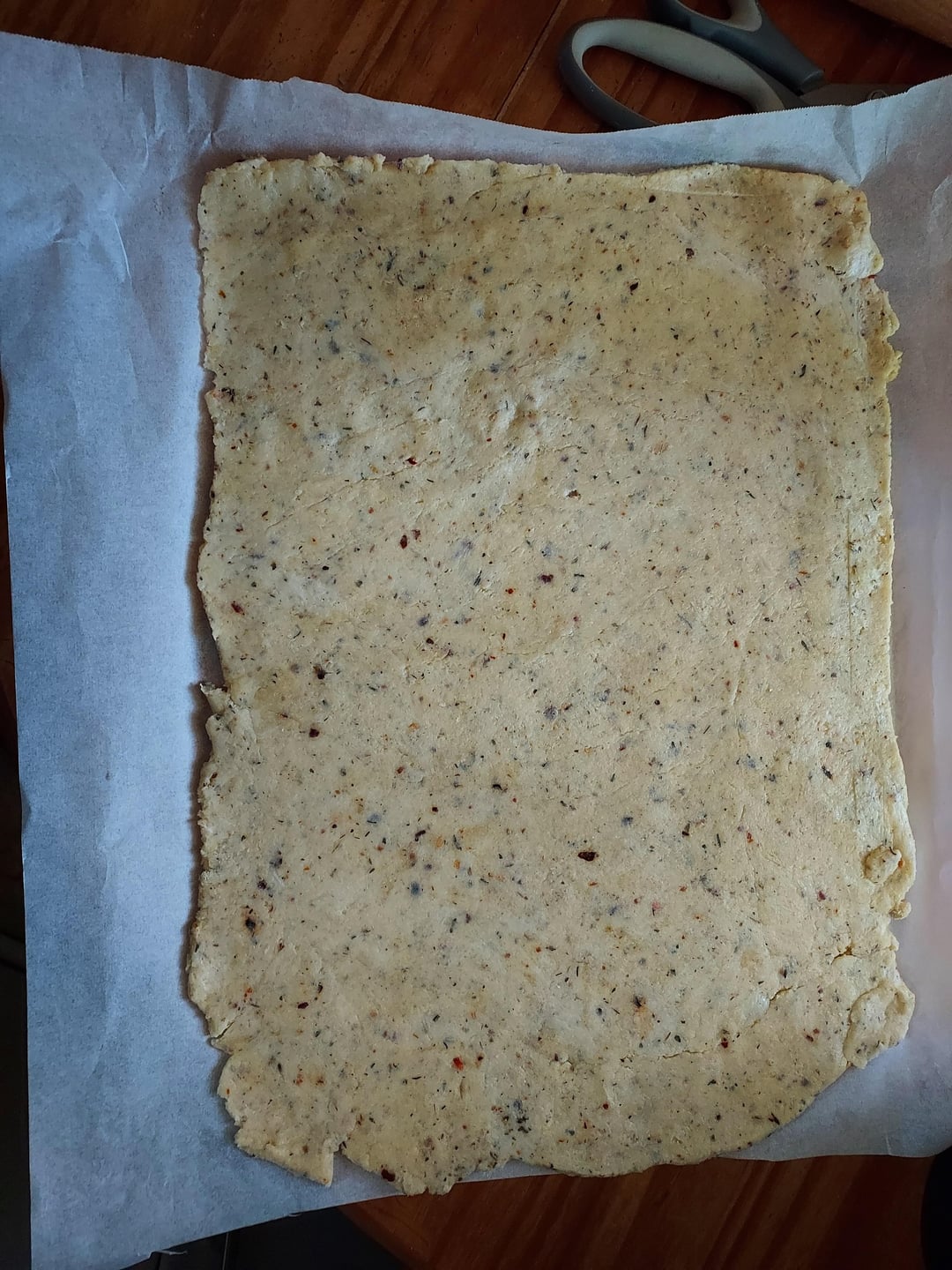 2. Spread dough on parchment paper, place on baking sheet with rack, prebake at 380 for 25min.