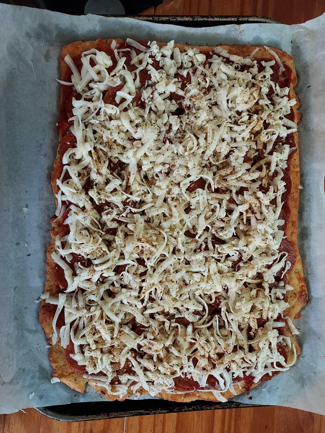 3. Top crust with toppings – sauce, onion, pepperoni and 1/2 lb shredded mozzarella.