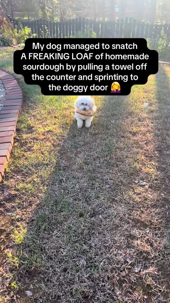 Set loaf on counter. Leave room. Chase fluffy dog to retrieve loaf.