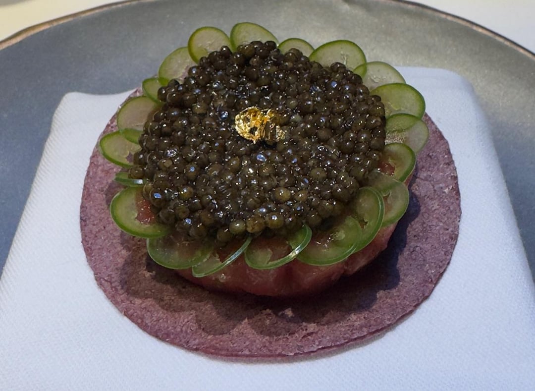 - Double caviar open — yes please. First was a bean and cheese tart, great opening. The next tuna and caviar with peppers bite was incredible and enormous.