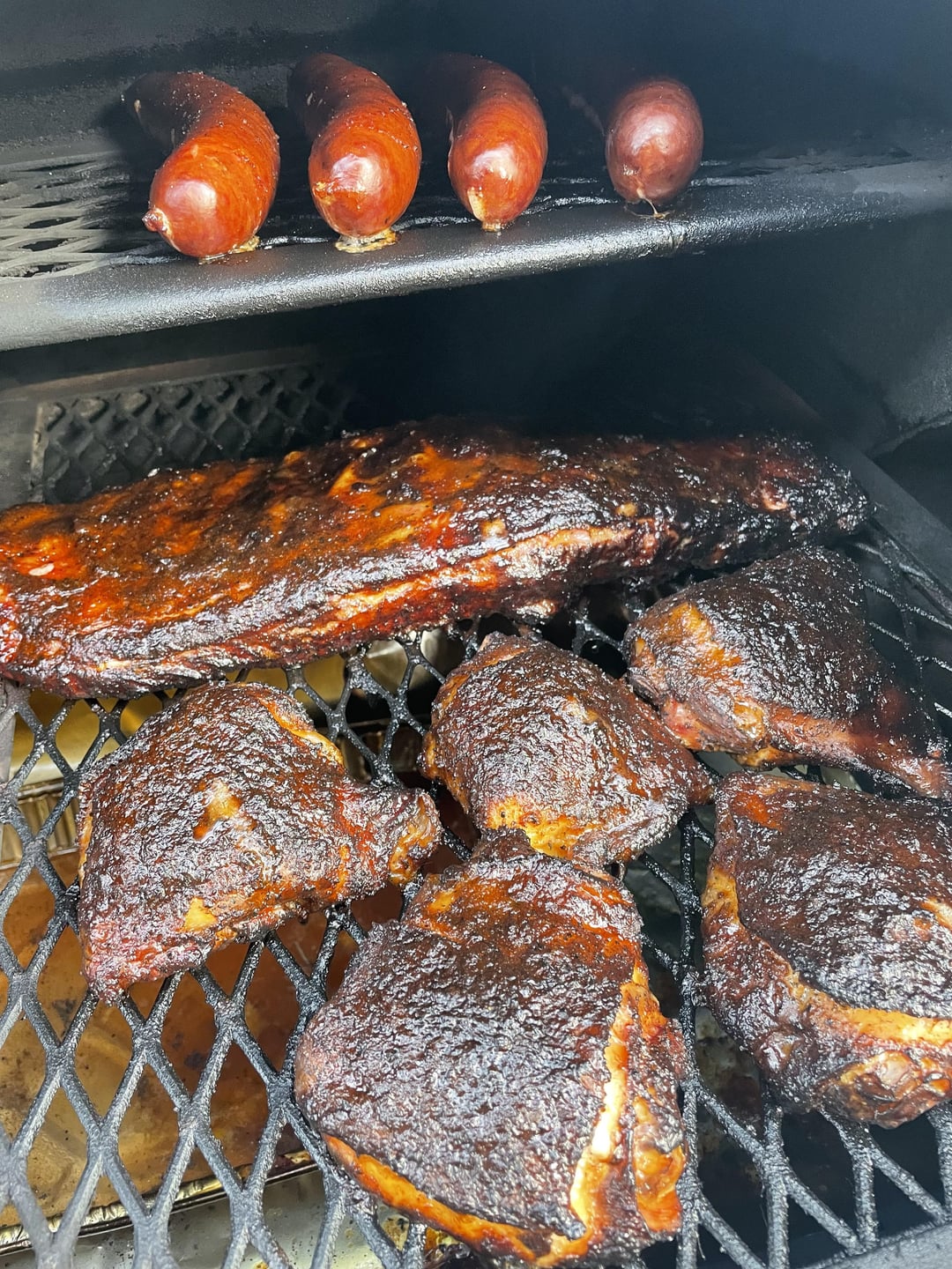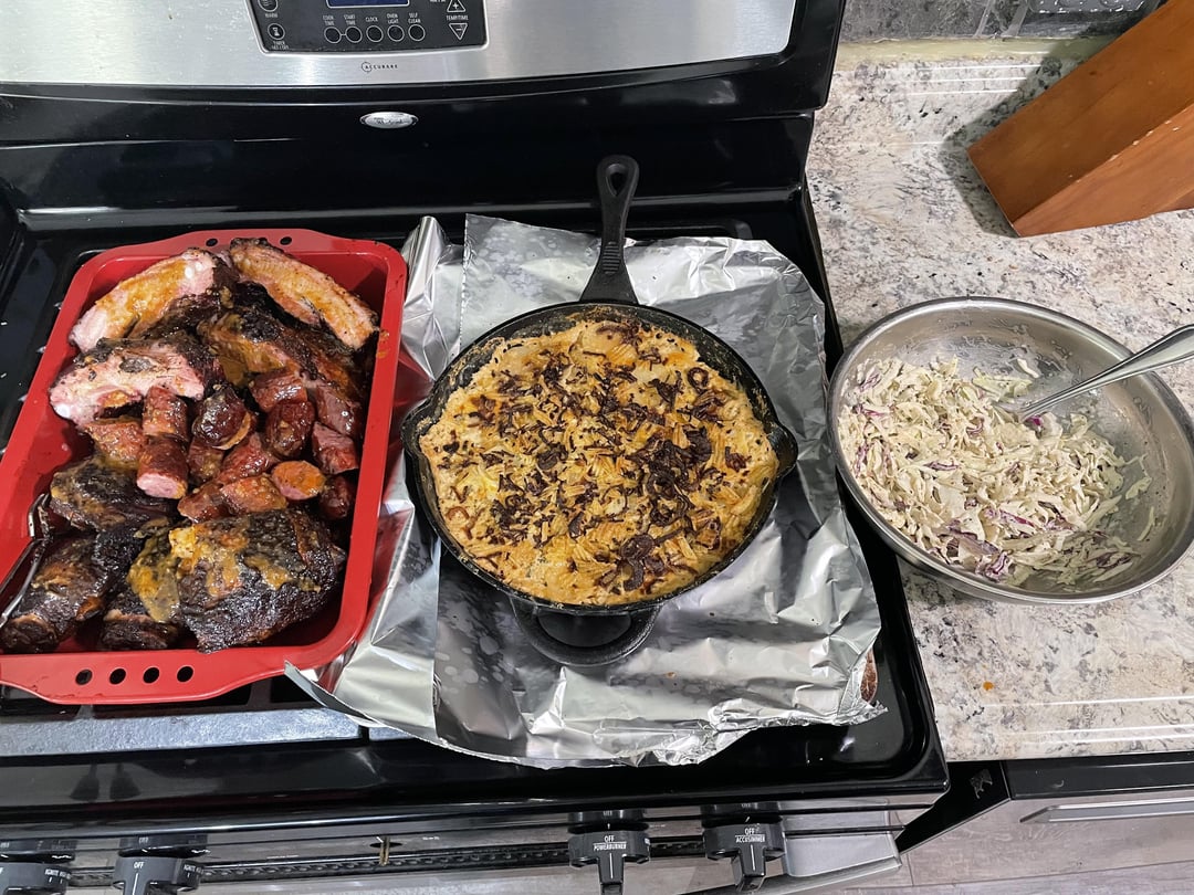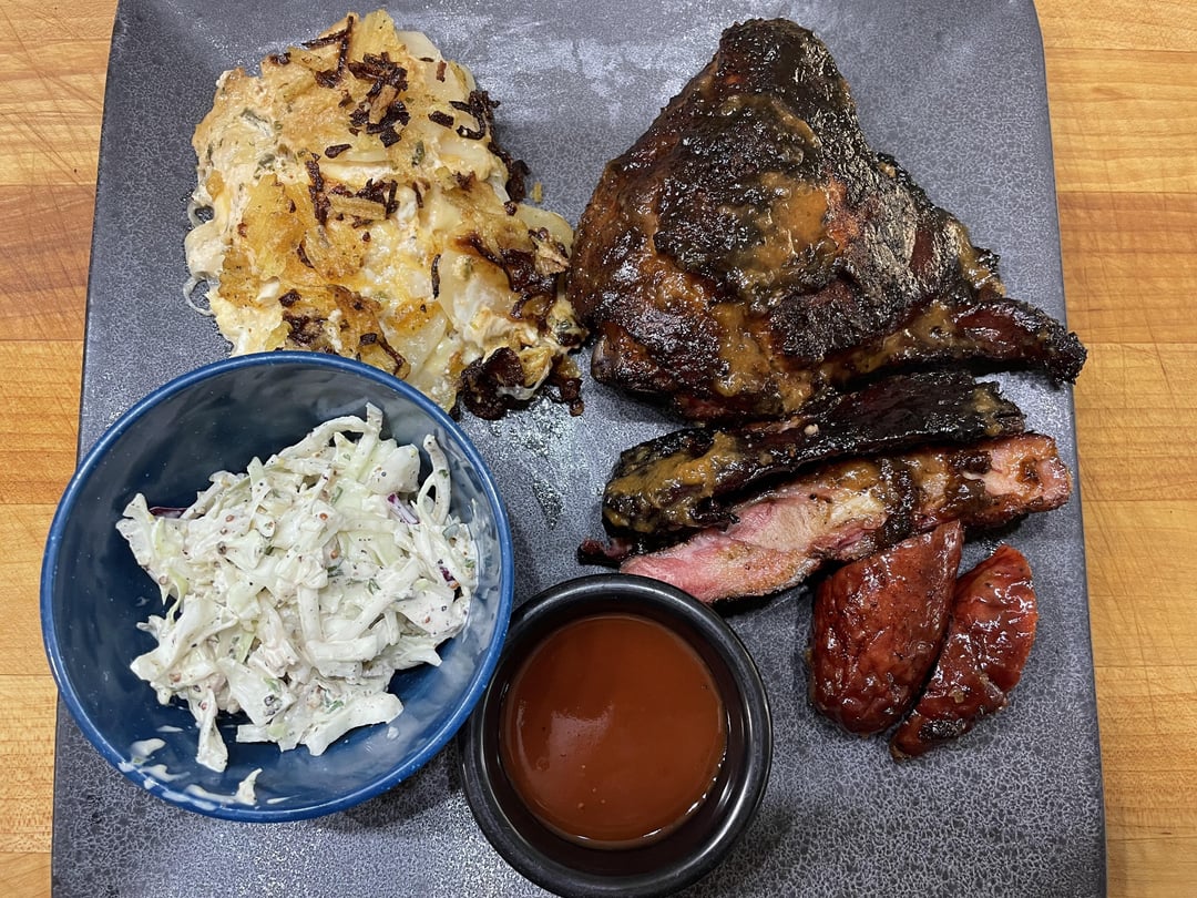 Good homemade 3 meat plate. Ribs, chicken thighs, sausages w/au gratin potatoes and a black pepper slaw.