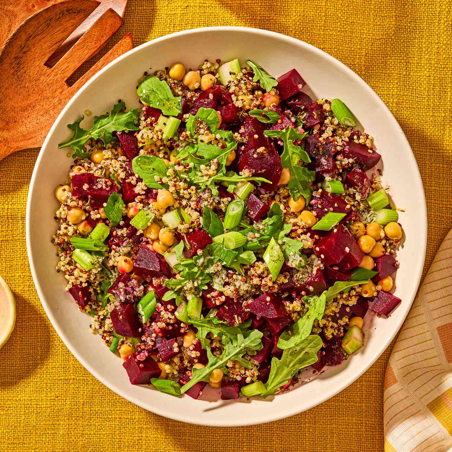 This easy, no-cook chickpea salad comes together in minutes. Leftover quinoa is great in this salad, but you could also use microwaveable quinoa to save on time. With a bright lemony-garlic dressing, this salad is the perfect side to accompany grilled chicken or roasted salmon.