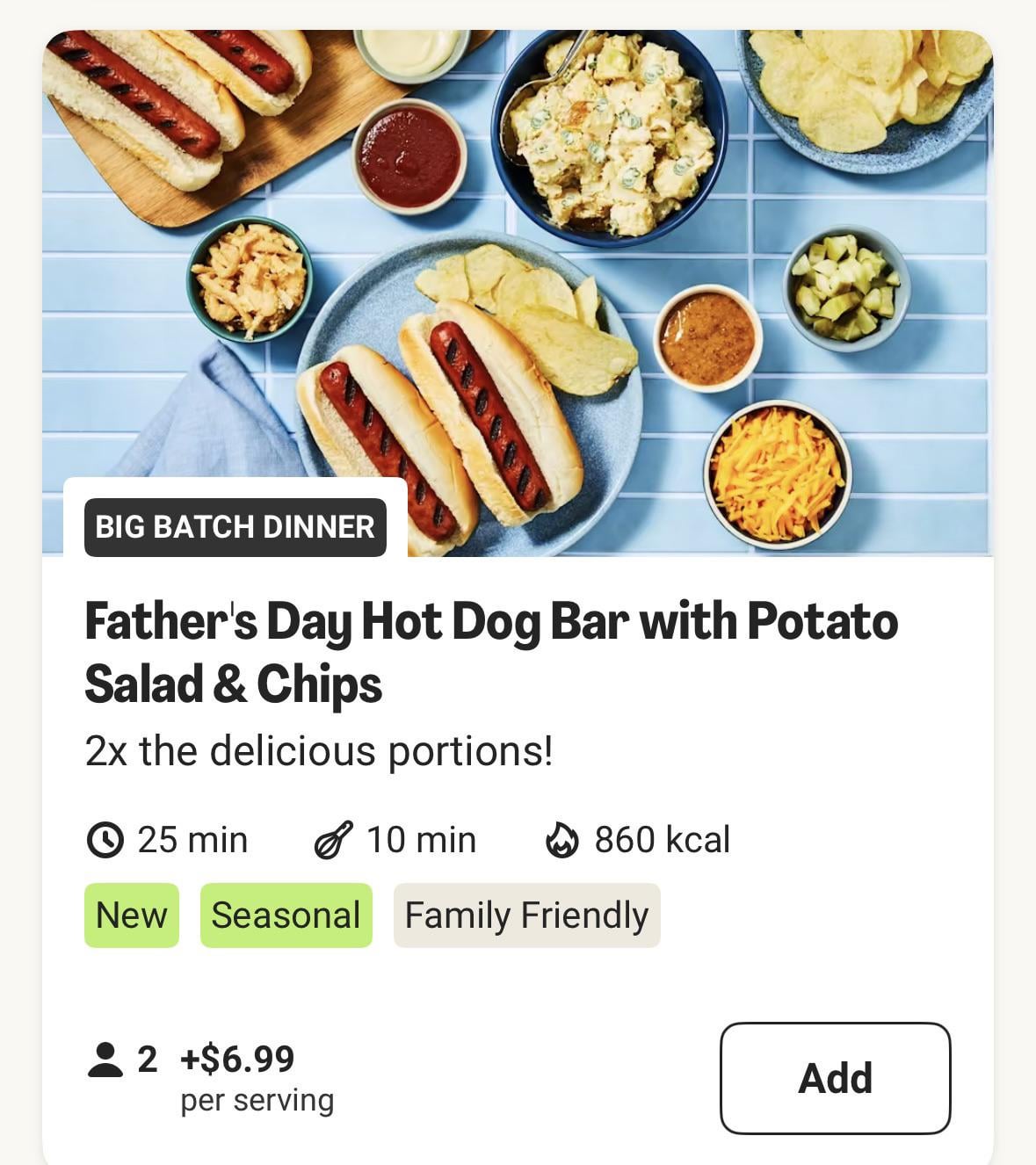 I know that Hello Fresh is meant for convenience but there really isn’t an added convenience here lol. And I know it’s a “big batch” but $40 for 4 hot dogs, chips, and potato salad is just wild to me. I love HF but I also don’t think they always make perfect decisions and just wanted to comment on how silly it seems to me.