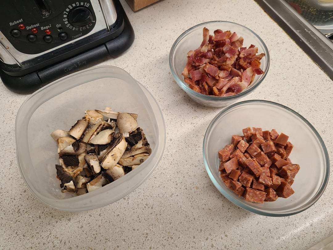 Anyone else like to experiment? Nothing crazy. This week I decided to dice my pepperoni, chop the mushrooms and went light on the cheese. I thought about roasting some tomatoes. Maybe I'll do that next week.