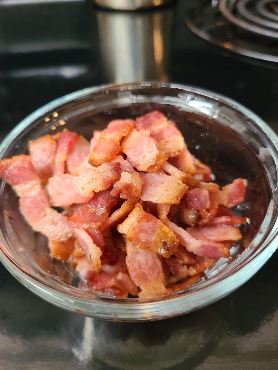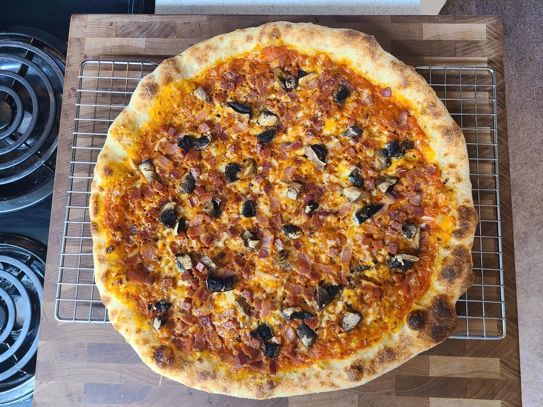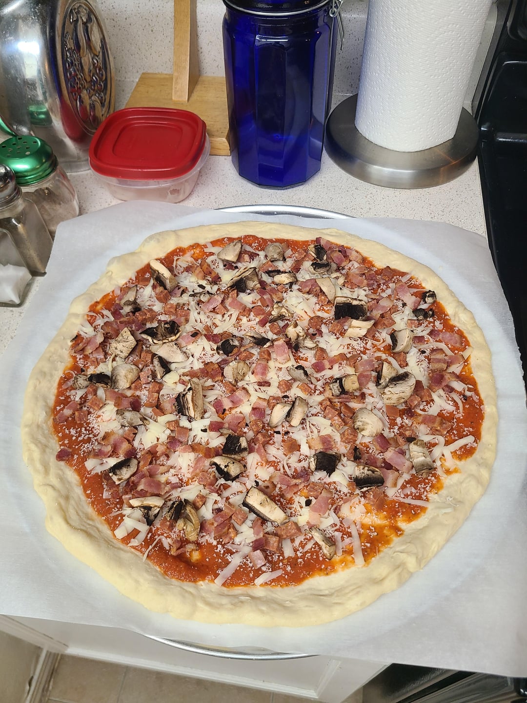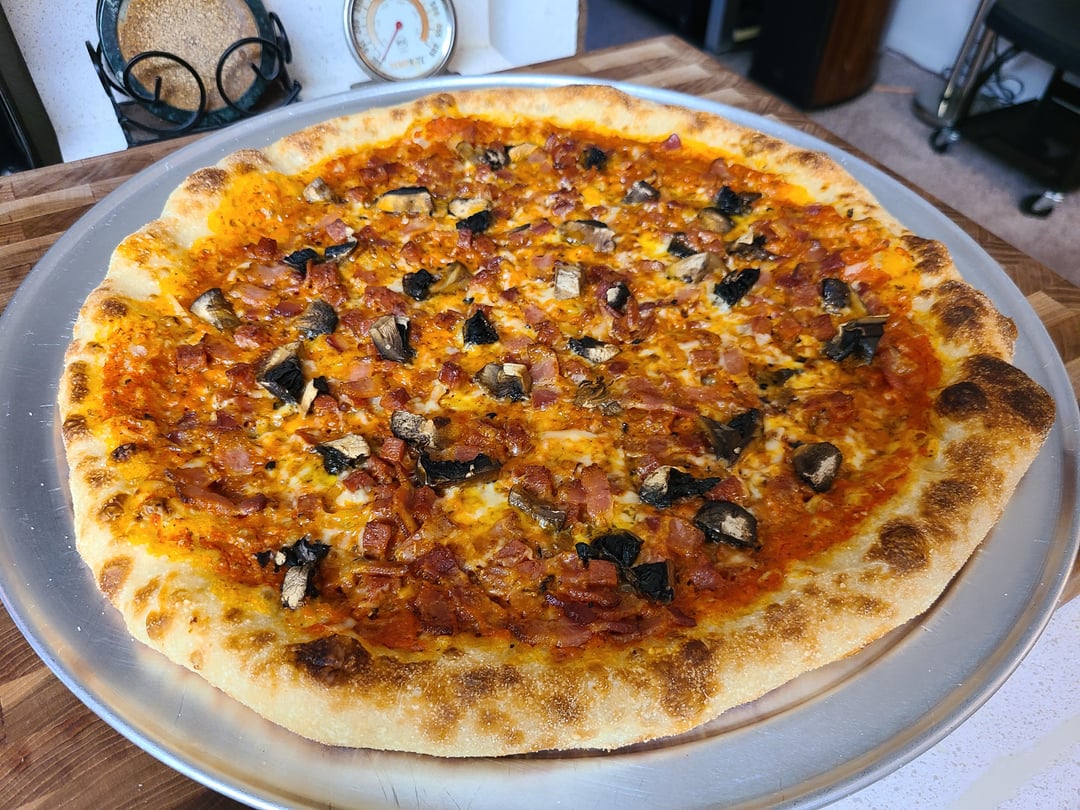 Hand diced pepperoni, bacon, fresh chopped mushrooms, (my own) tomato sauce, fresh grated Parmesan and Romano, fresh shredded mozz, provolone and smoked Gouda. Drizzled some EVOO after it came out of the oven. 8-minute bake, the last two on high broil.