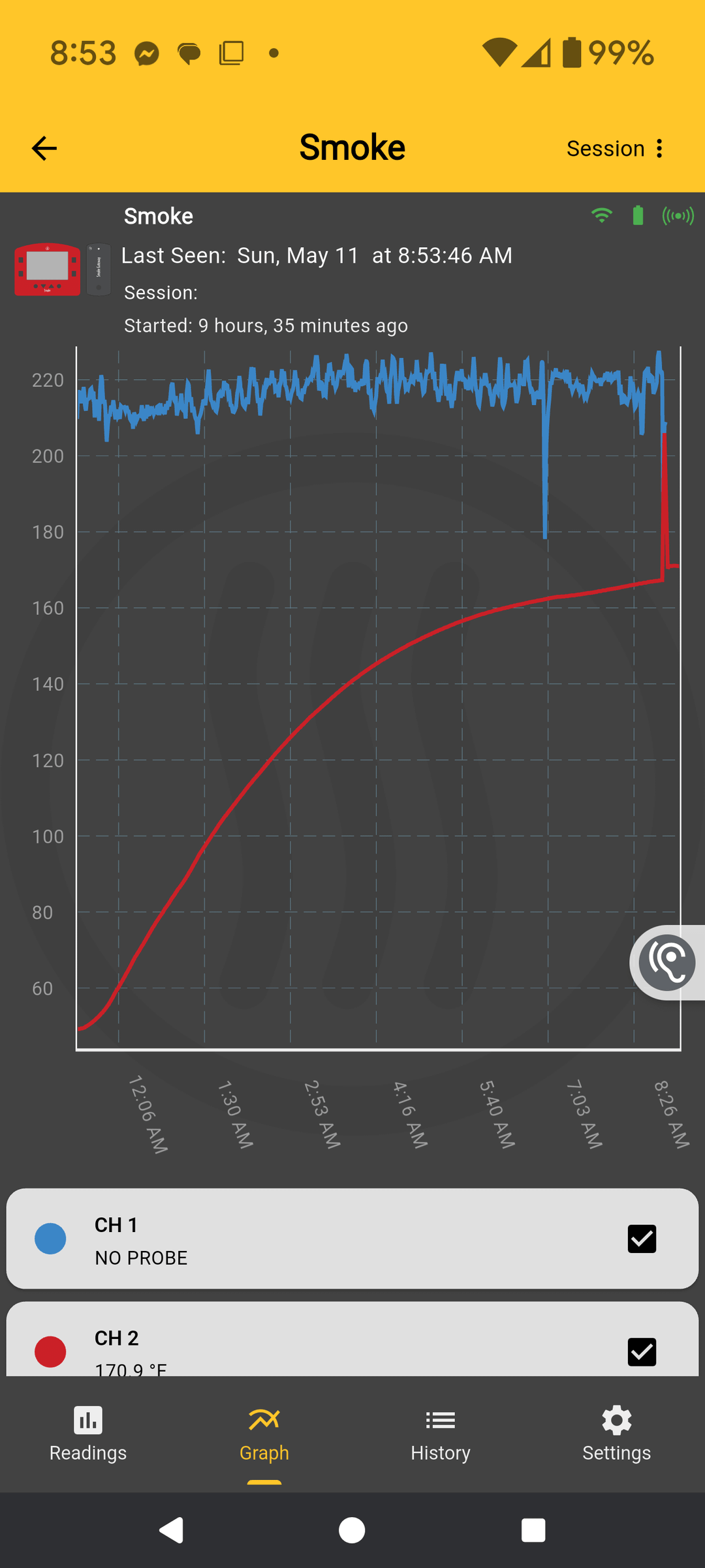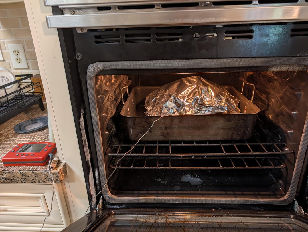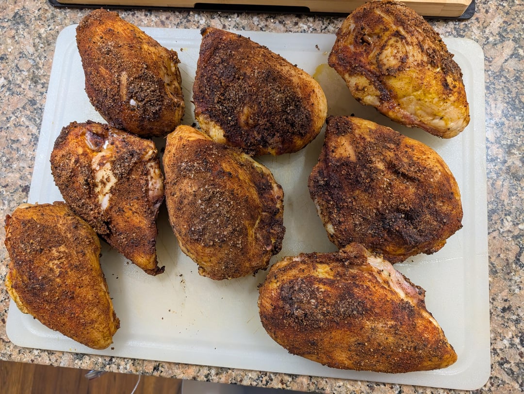 10# bone-in butt. Brother franklins dalmation + garlic and chipotle, then Matt pitmans honey hog. Started 1130 pm for 9hrs at 225 supersmoke to 168. Tinfoil wrap into oven at 350 to 203, probe tender. The split breasts with rib meat have dalmation same, plus pitmans Gospel. 225 supersmoke to 130, jacked Traeger to 350 to 150 to crisp skin. The graph is Thermoworks Smoke Gateway, which is what I primarily use to monitor. You can see the 168° +- point where I wrapped and moved butt to oven, them put in breasts. Once I put in chicken, I used Traeger app to monitor to 135, then jack on to 150.