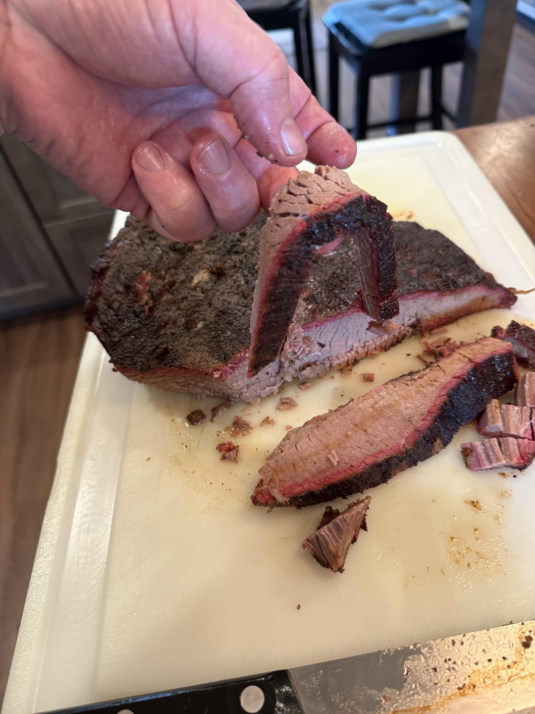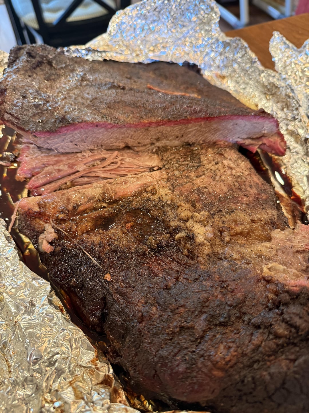 Cooked an 18 lb brisket and had to lay it on top of a rib rack due to the length. Ran it at 225 for 4 hrs and it fell into a stall at 160-ish. Put it in a foil boat and laid it in the grate without the rib rack (the meat had shrunk enough to barely fit). The Kamado temp went up from 225 to 250 and I kept adjusting to get it to stop any further temp rises. It ran about 7 hrs between 250 and 230. And I pulled it off at 203f (internal temp). Wrapped it in foil and laid it in a cooler for 6 hrs.
