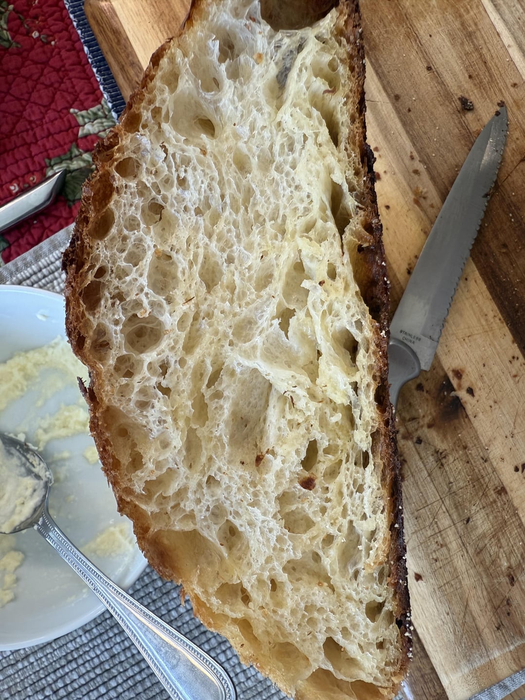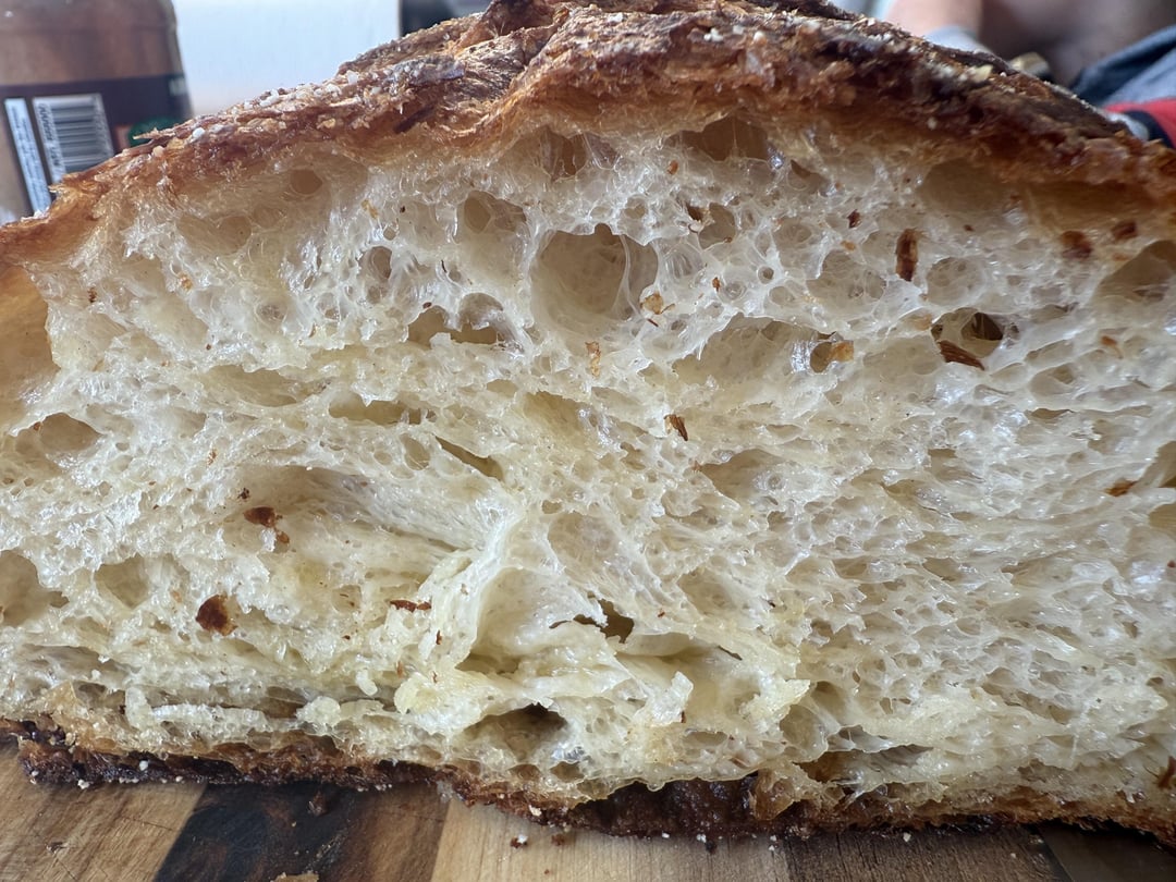 After many failures, I finally found a recipe that worked!! The crust is absolutely delicious, like a crunchy croissant, and the inside is incredibly moist. I think this recipe is also quite fool proof, it’s a lot of gentle coil folds and resting, which is what I think produces the amazing crumb and makes it more forgiving.